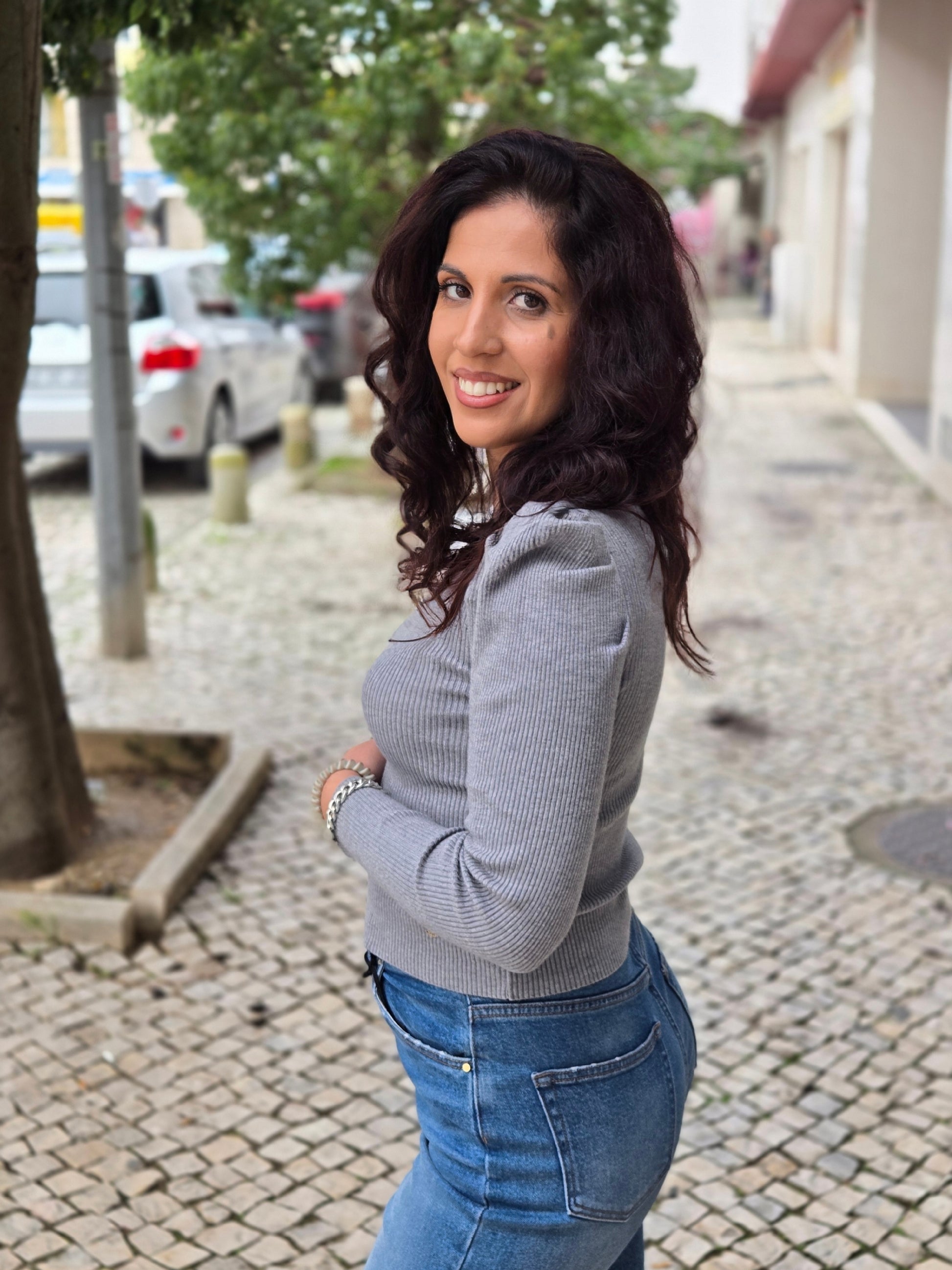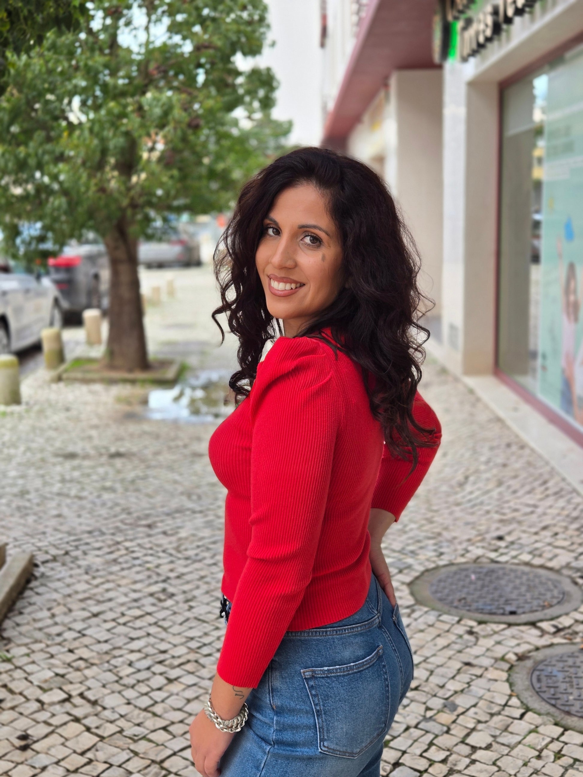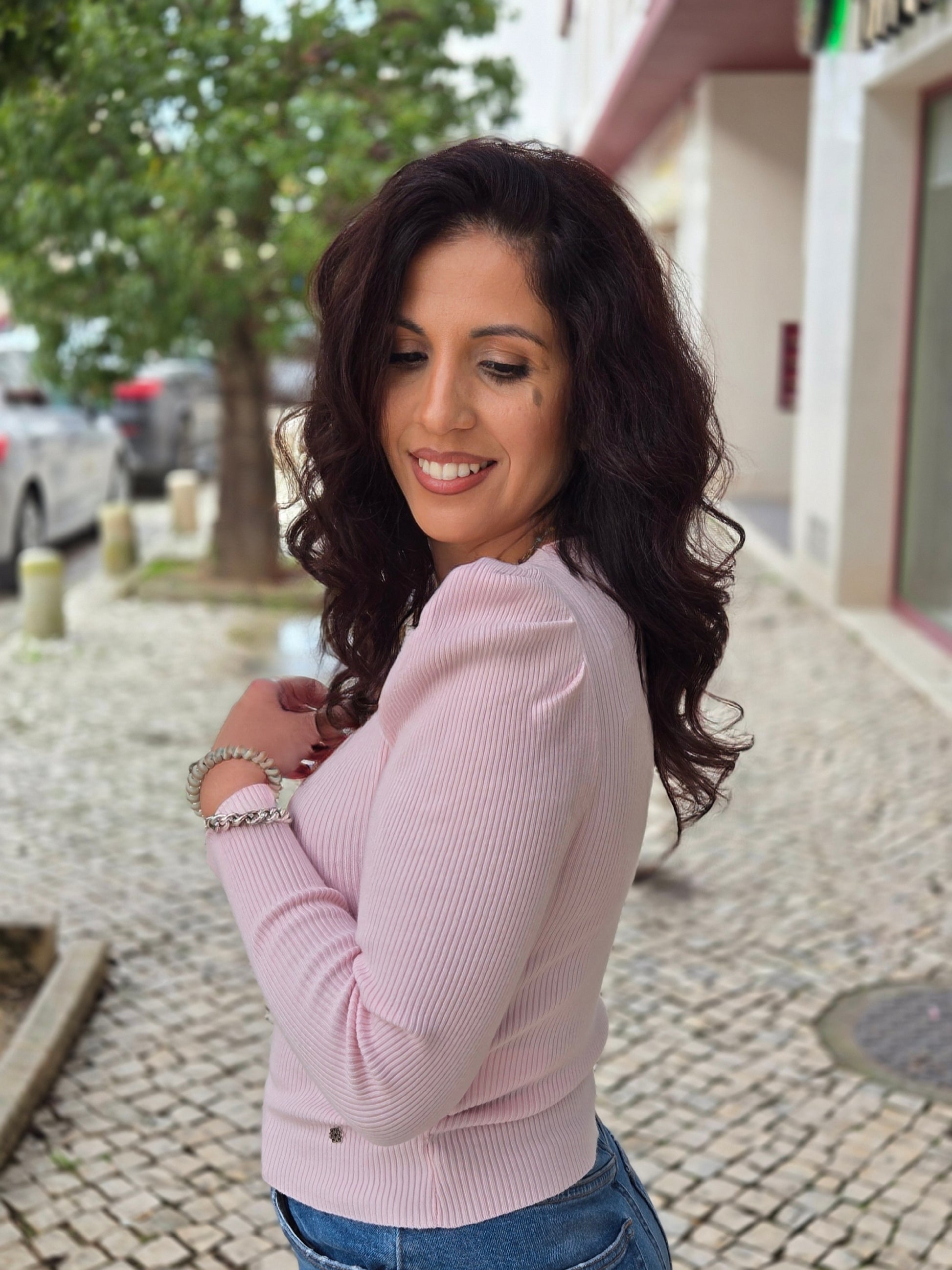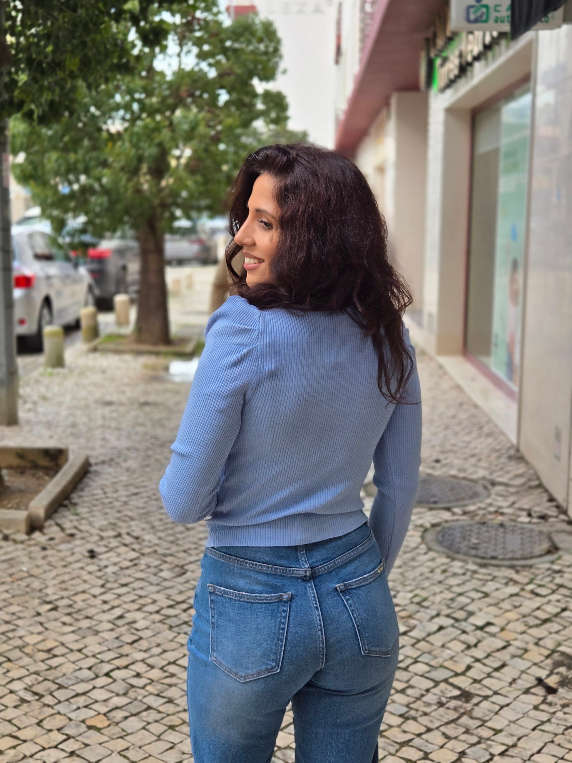 Camisola de malha canelada com decote em V e manga comprida com detalhe abalonada.