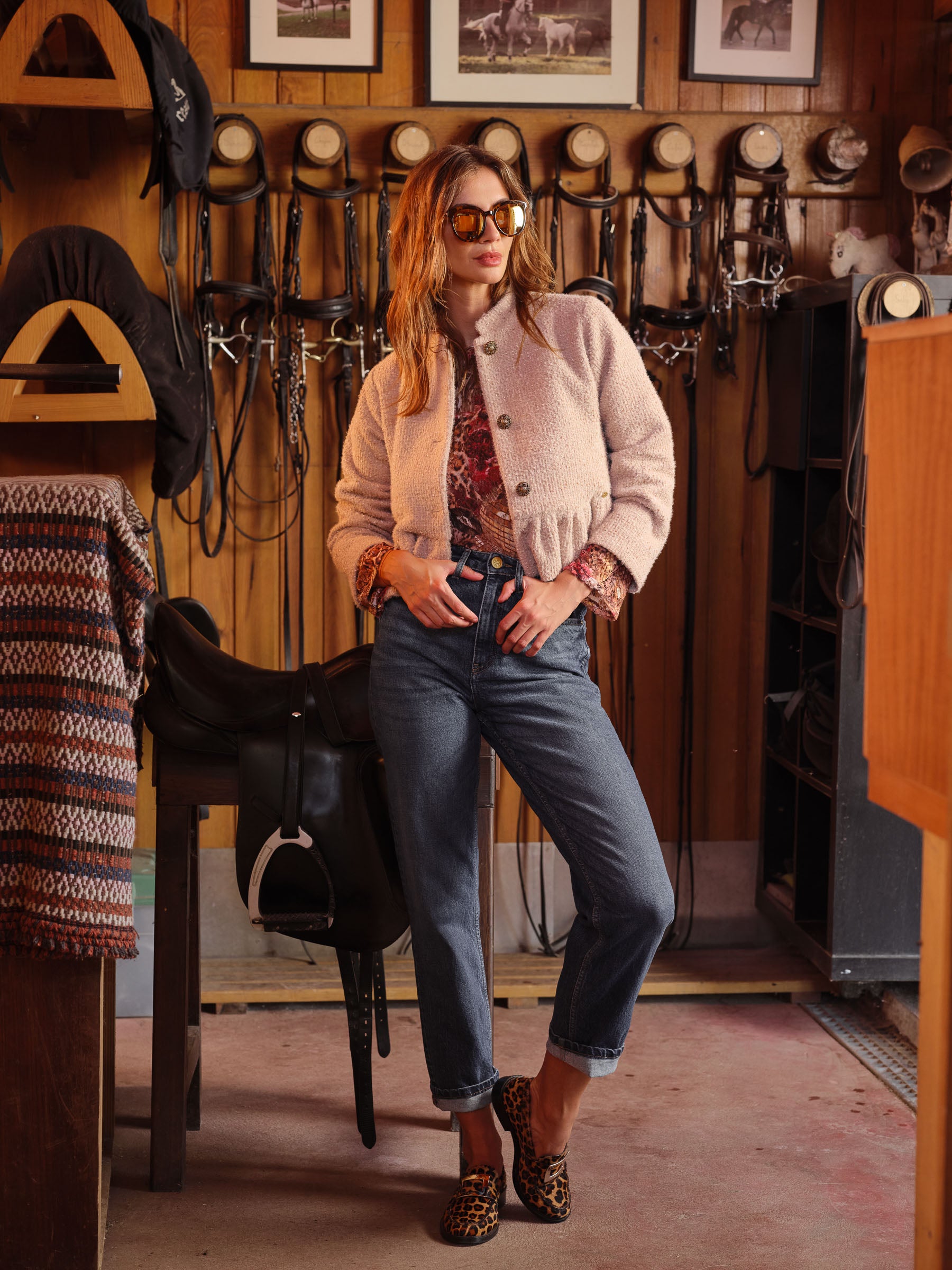 Casaco curto com gola subida e manga comprida. Detalhe de brilho com efeito pregas. Fecho frontal com botões.