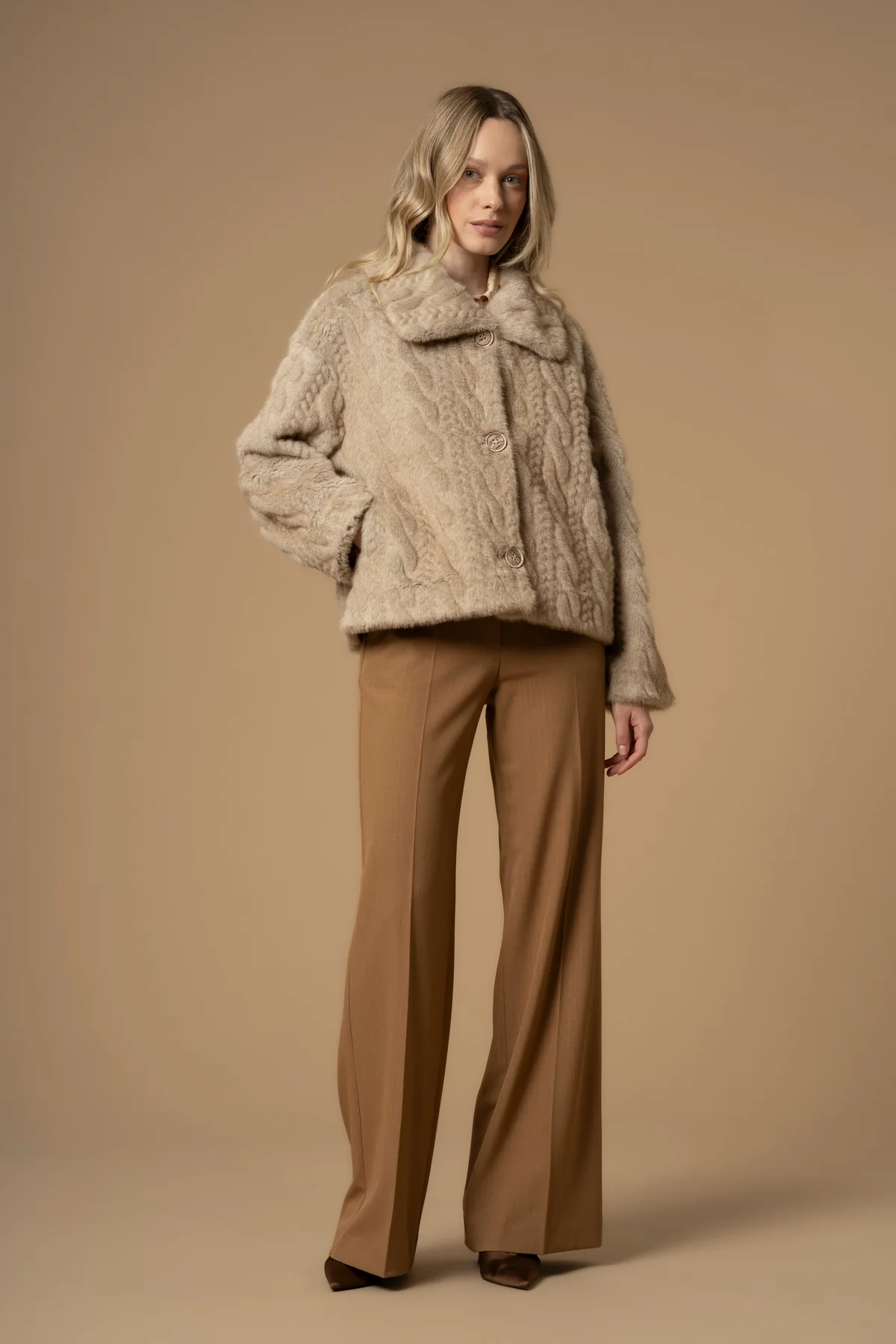 Casaco reversivel em fantasia. Manga comprida. Bolsos laterais ocultos na costura. Fecho frontal com botões.