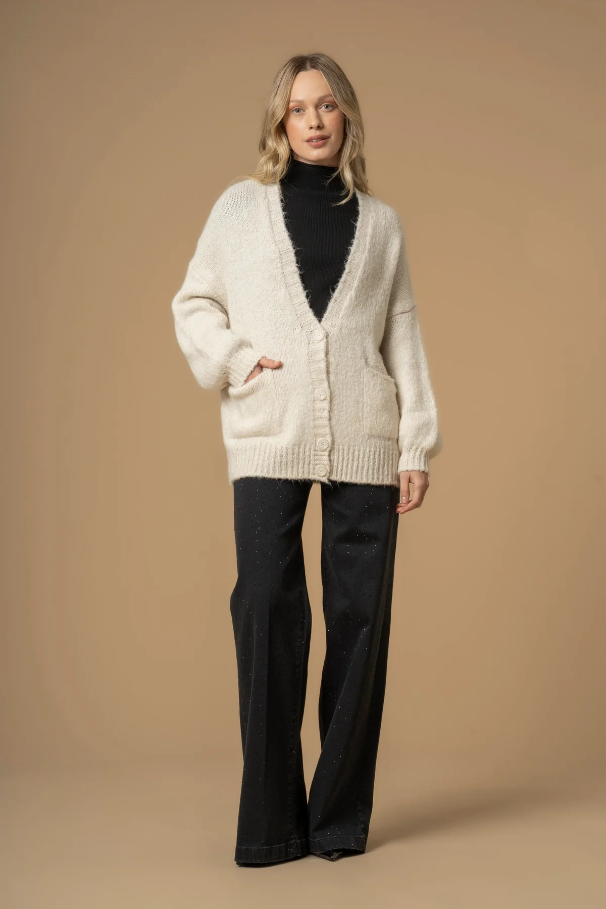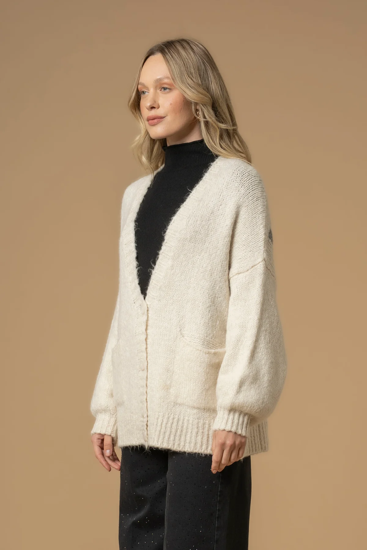 Casaco com decote em bico e manga comprida. Bolsos de chapa à frente. Detalhe de lettering nas costas. Fecho frontal com botões.