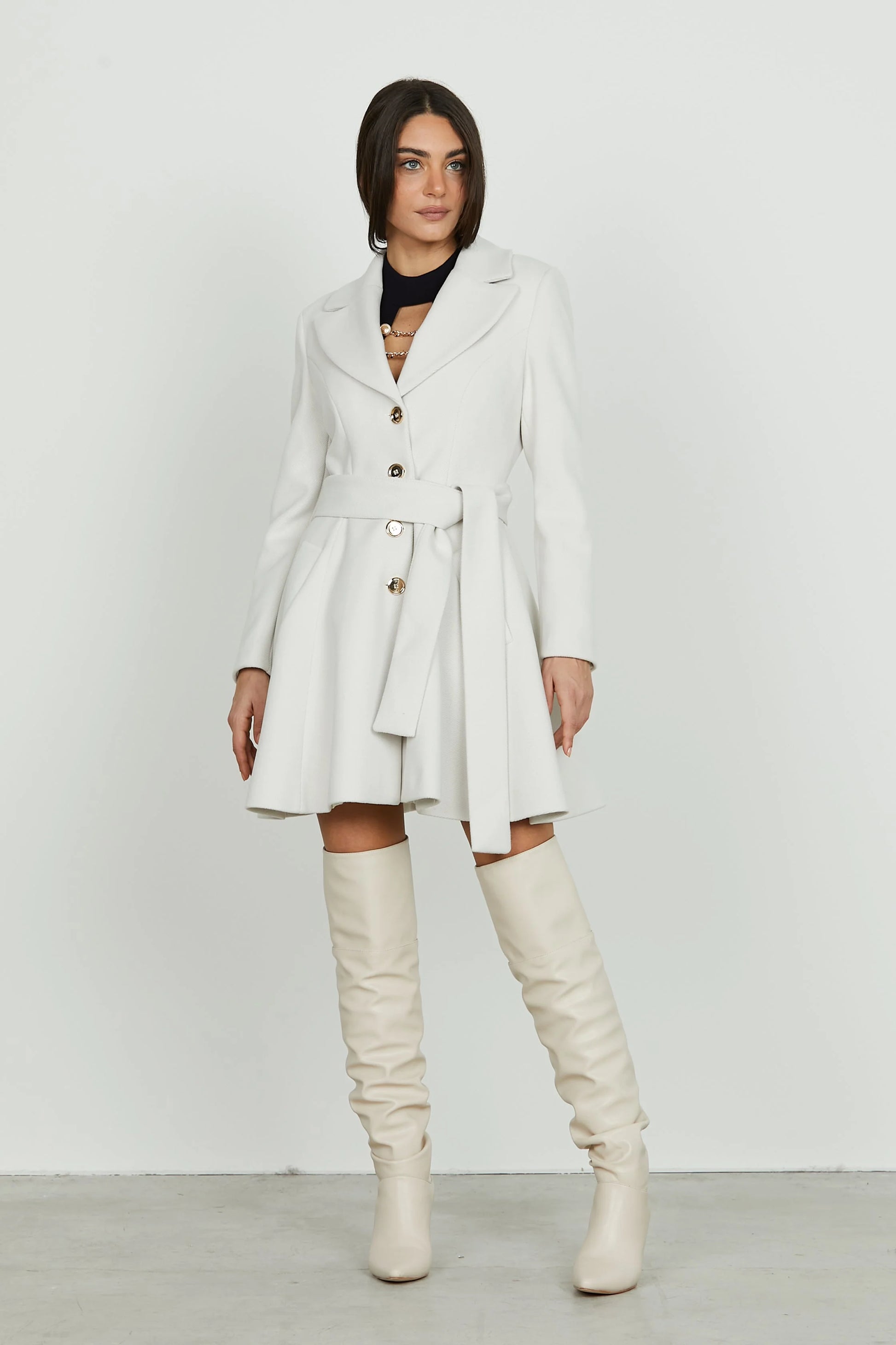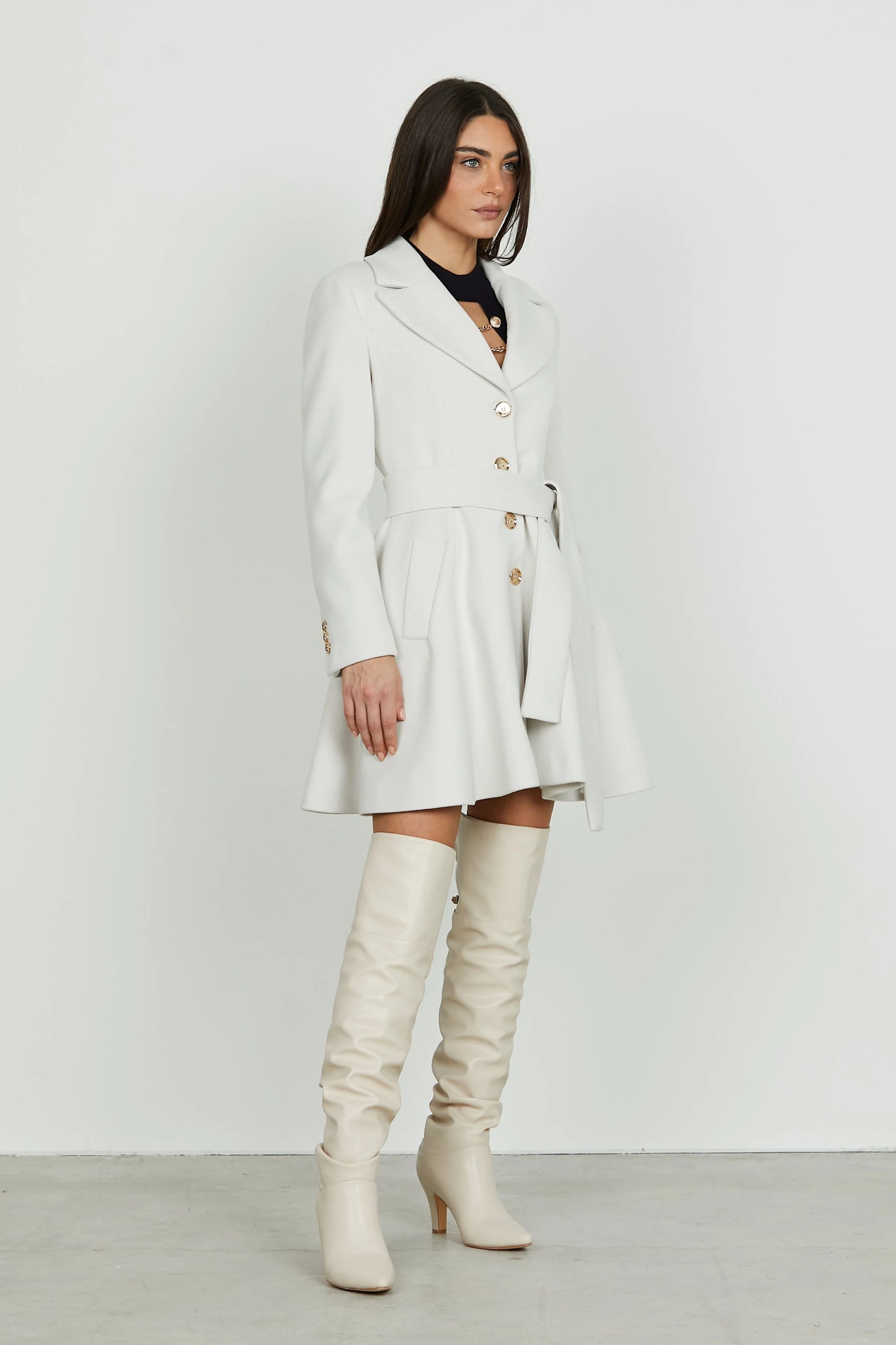 Casaco com gola de abas e manga comprida. Bolsos à frente com linha viva. Fecho frontal com botões e cinto a combinar.