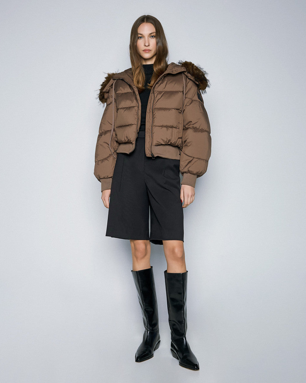Casaco curto acolchoado com gola de pêlo removivel. Bolsos laterais. Detalhes de punhos e cintura canelados. Fecho frontal com fecho de correr.