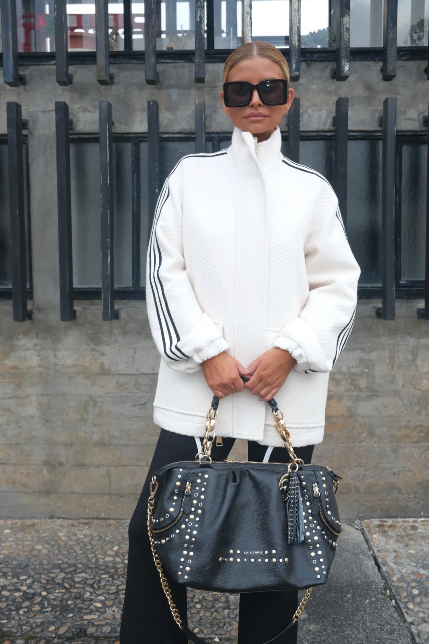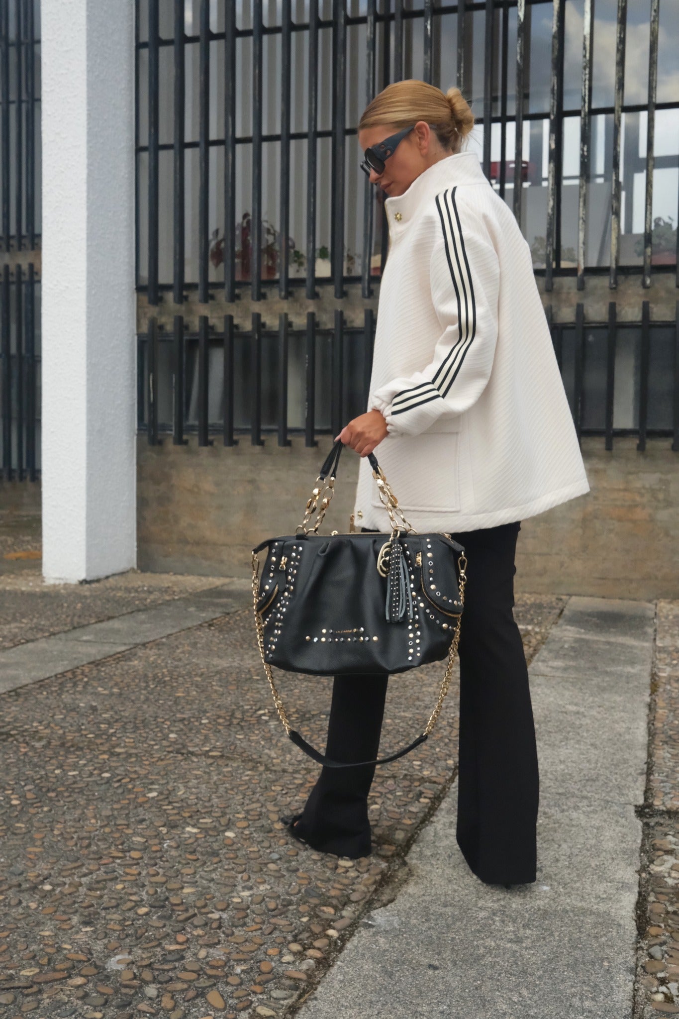 Casaco com lista lateral nas mangas . Bolsos Frontais.