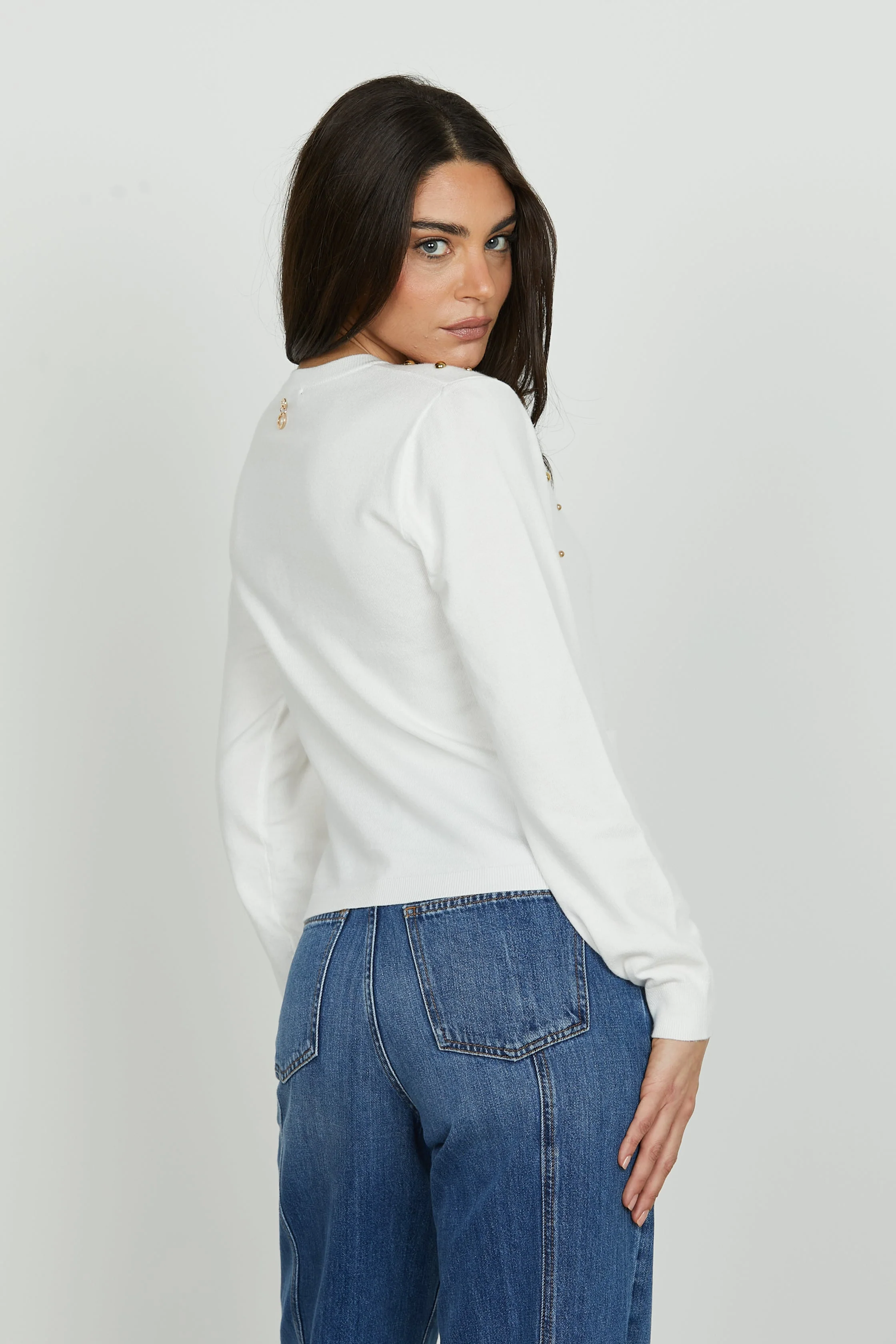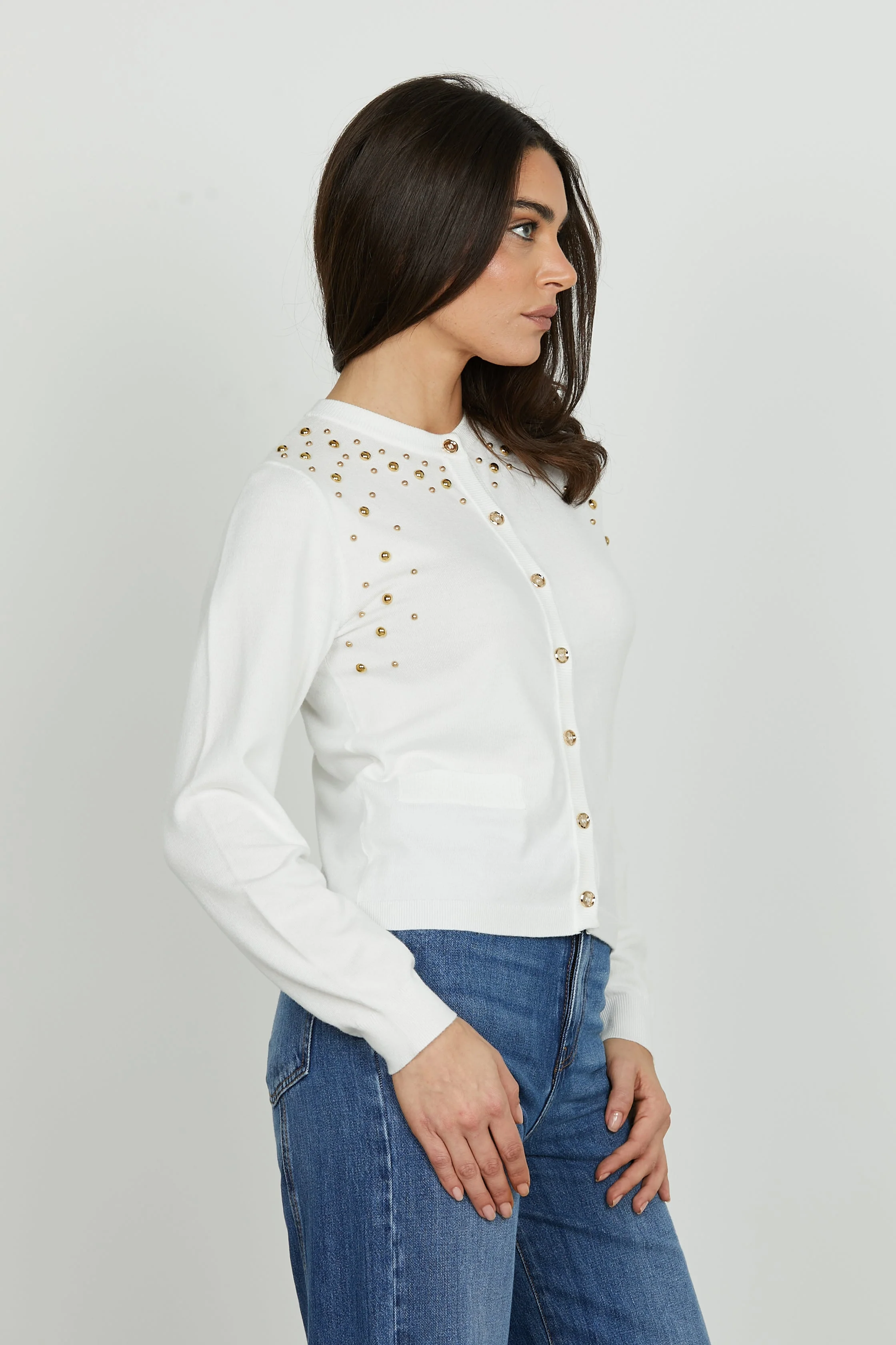 Casaco de malha com manga comprida. Detalhe de bolsos e tachas na frente. Aperta mediante botões.