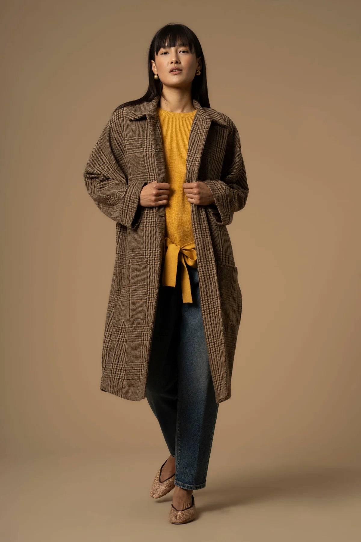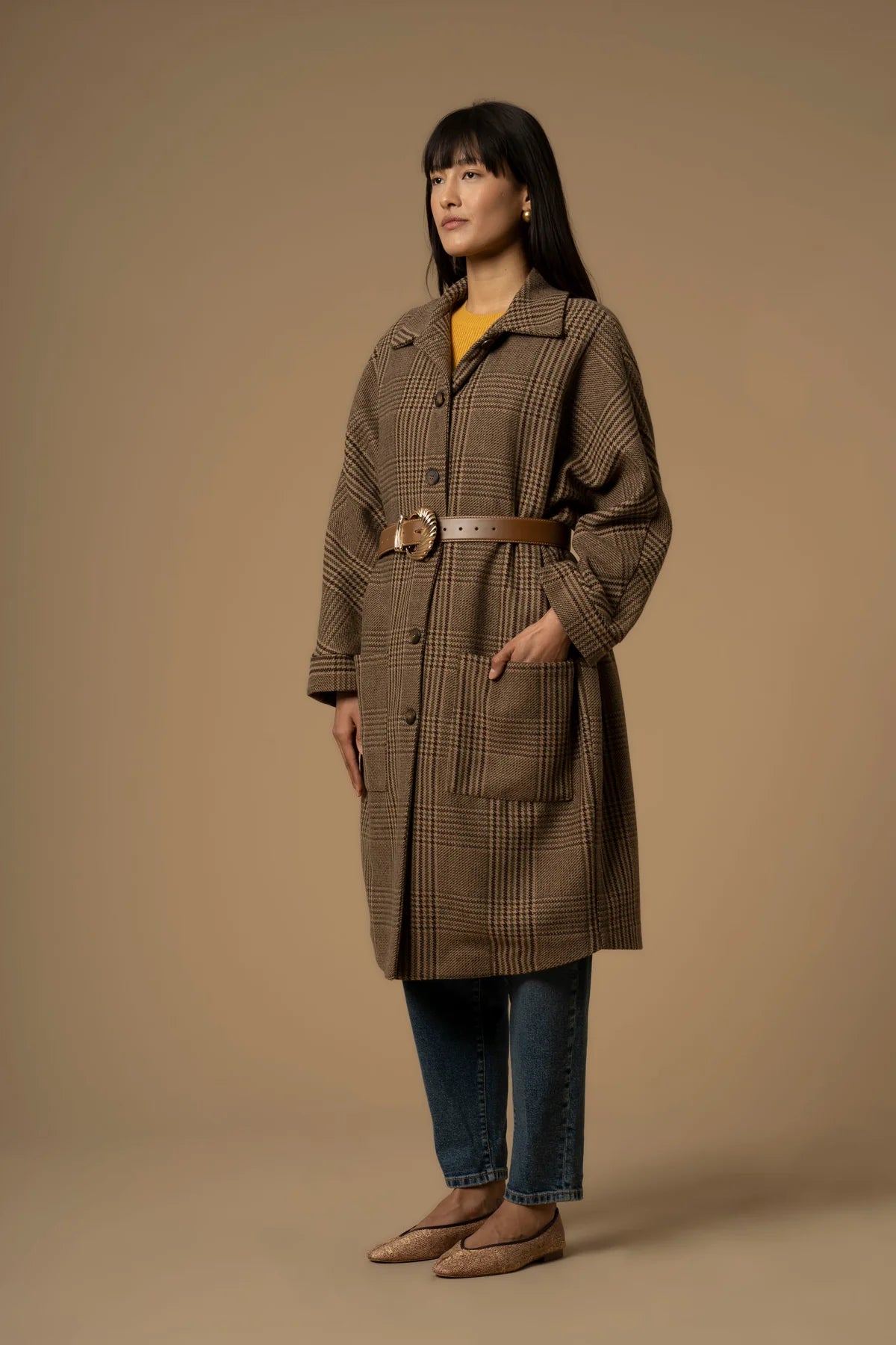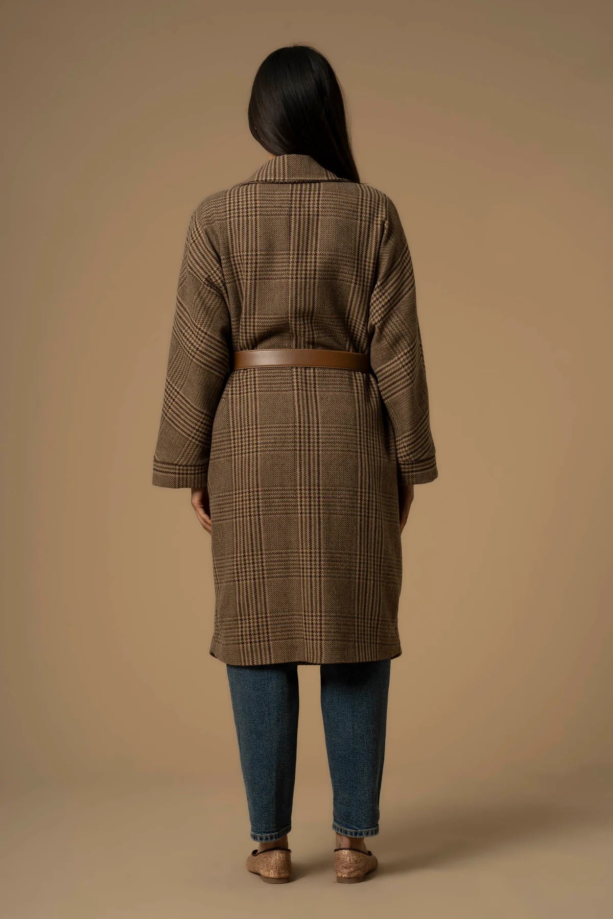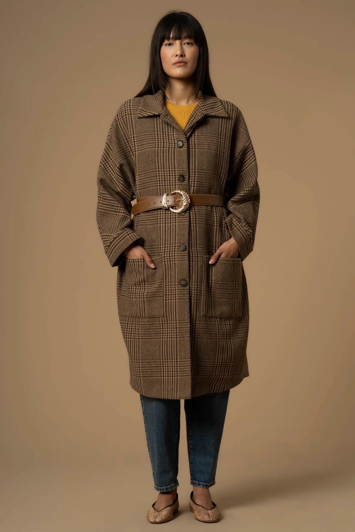 Casaco com gola de lapela. Manga comprida. Bolsos de chapa à frente. Cinto em contraste com fivela. Fecho frontal com botões de pressão.