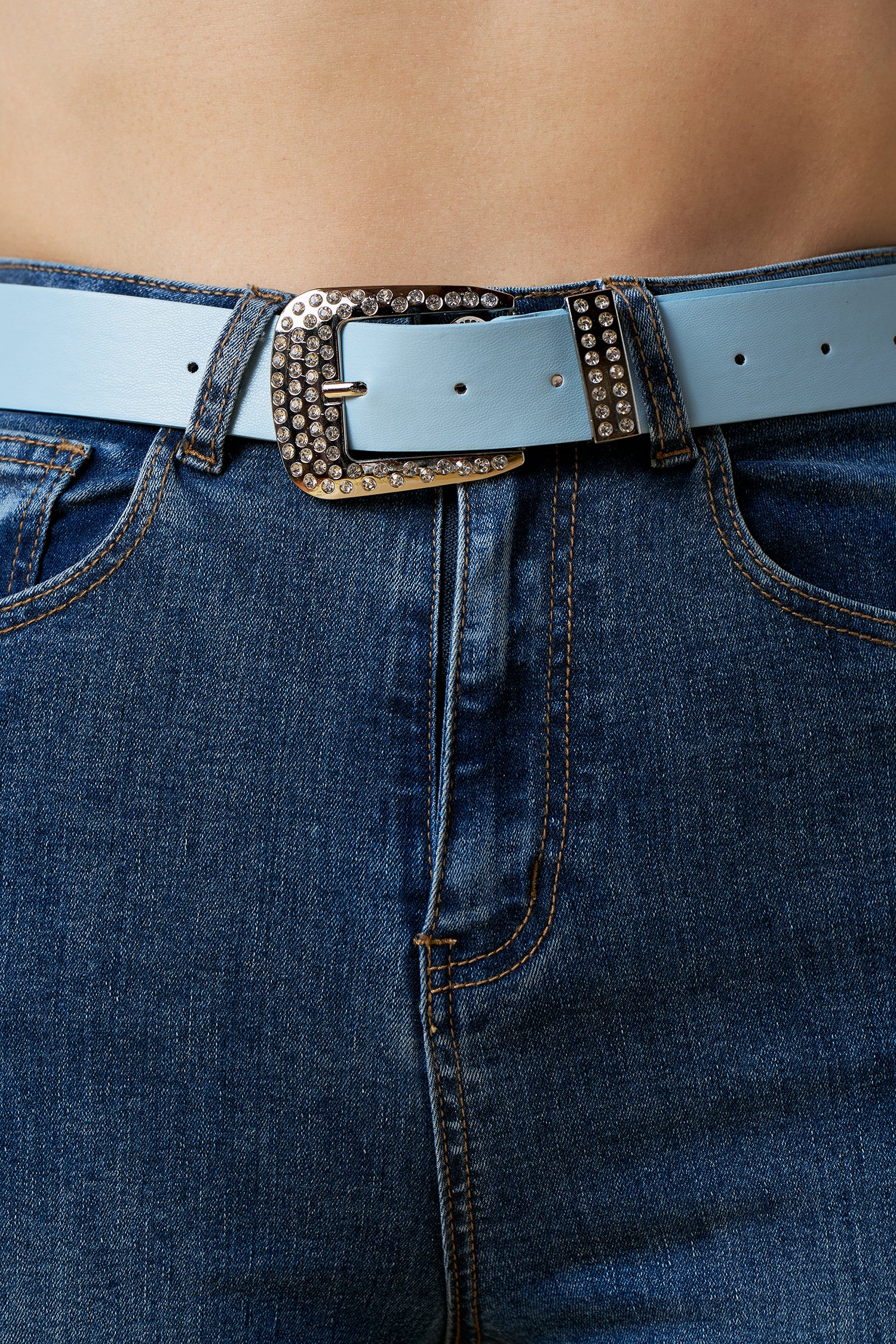 Cinto com fivela larga totalmente revestida com strass brilhantes que capturam a luz a cada movimento, criando um efeito deslumbrante. As bordas apresentam relevo metálico que realça o design e adiciona sofisticação ao acabamento.
