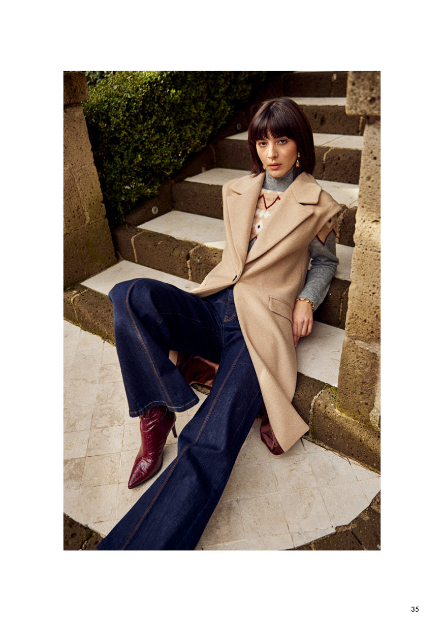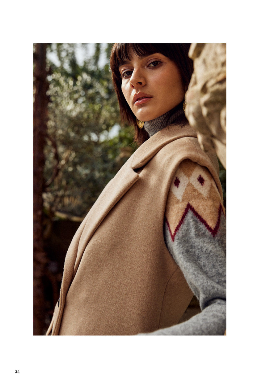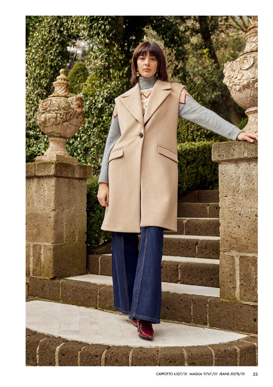 Colete com gola de lapela e manga cava. Bolsos frontais de aba. Bainha com abertura nas costas. Aperta à frente com botão.