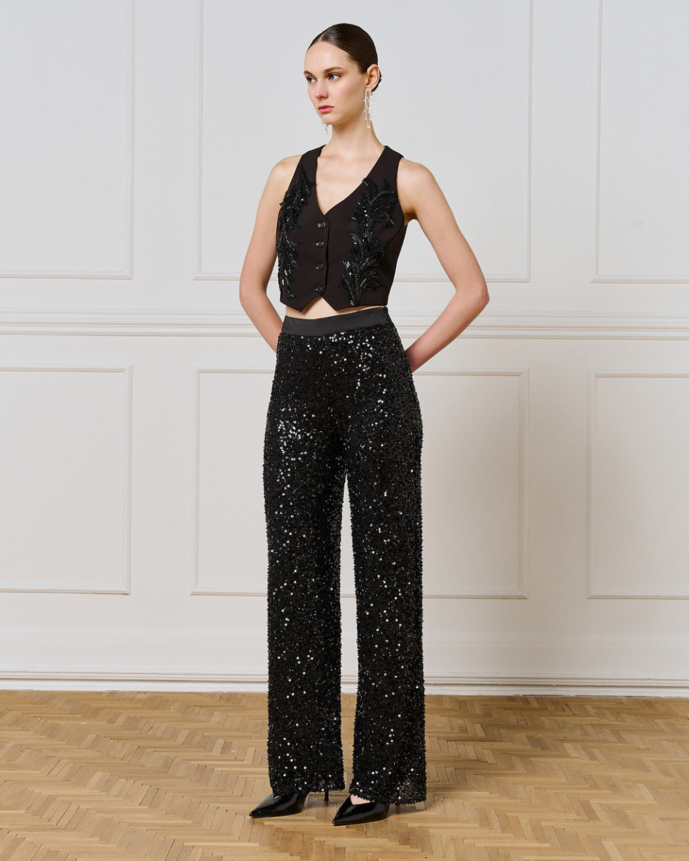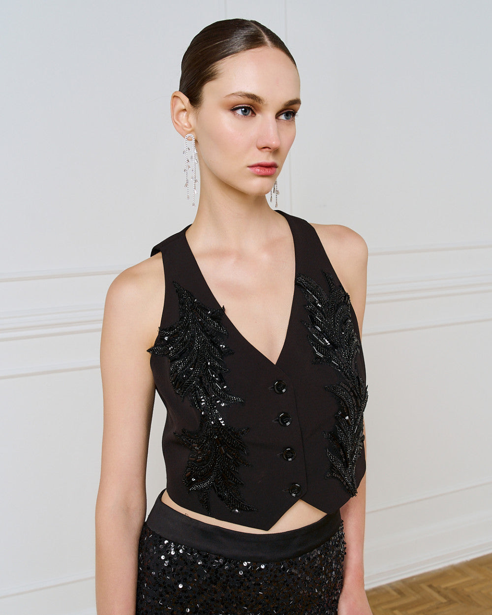 Colete com decote em v. Bordado de lantejoulas. Forro interior. Fecho frontal com botões.