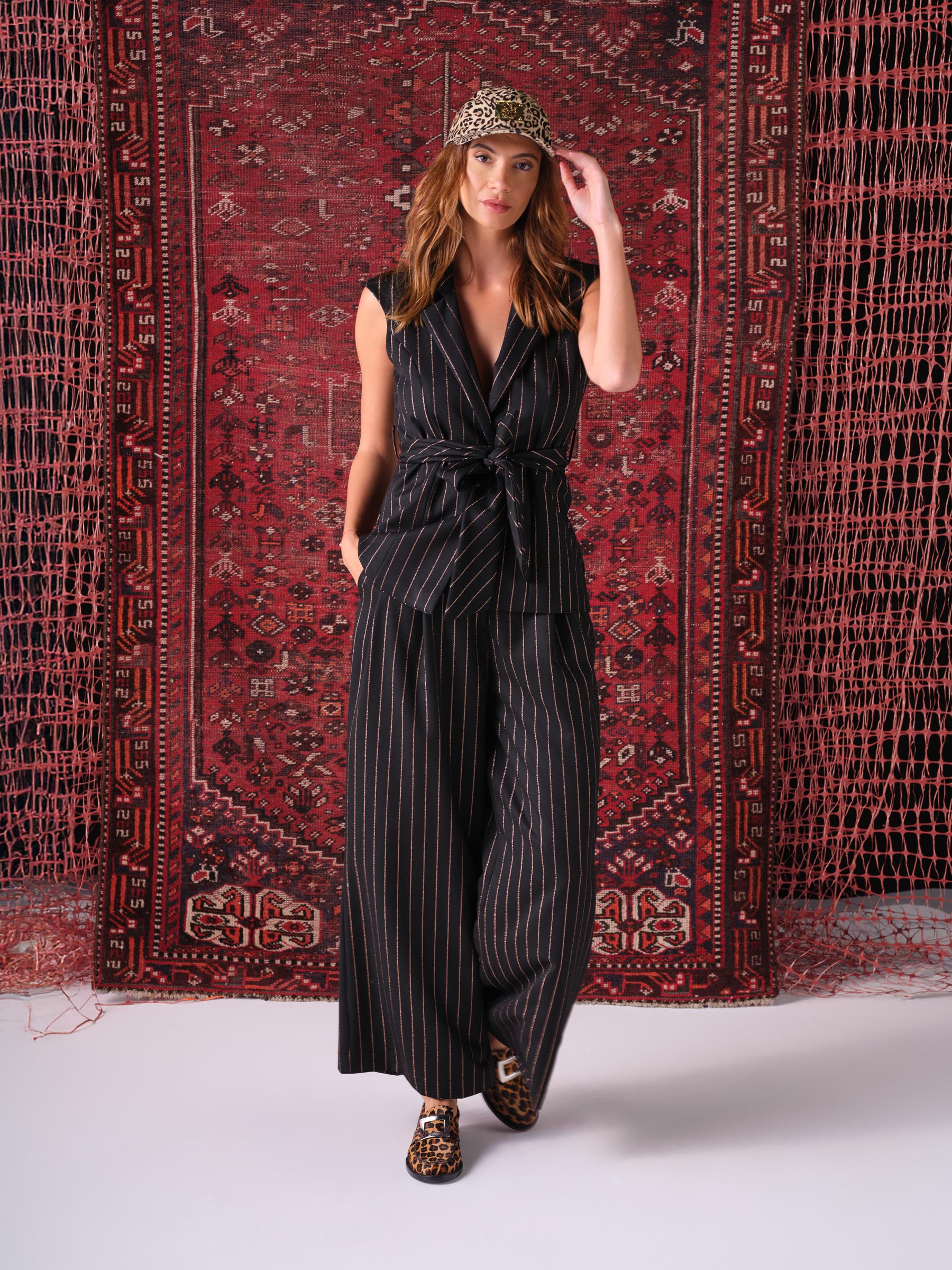 Colete com gola de lapela e manga cava. Riscas do tom em rose gold em contraste. Fecho cruzado com cinto no mesmo tecido.