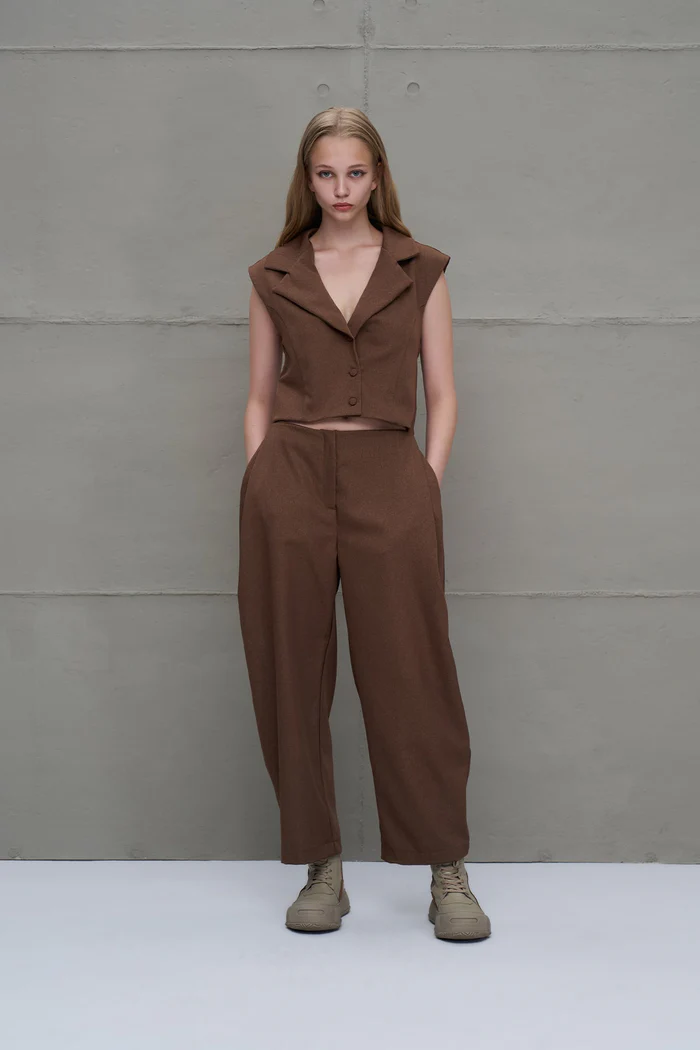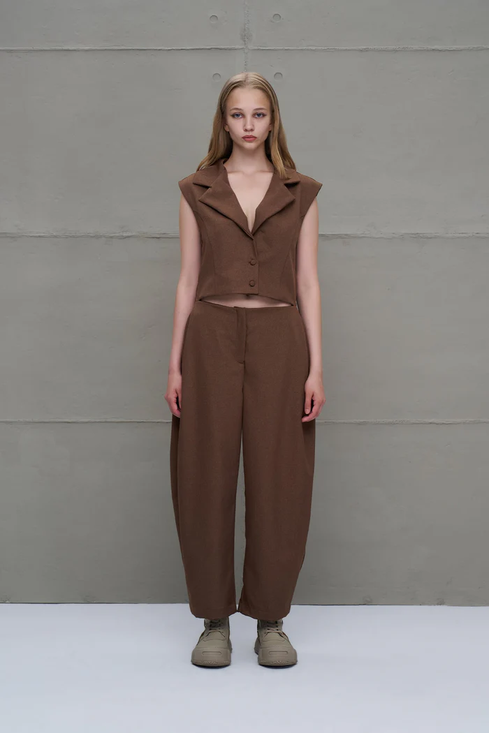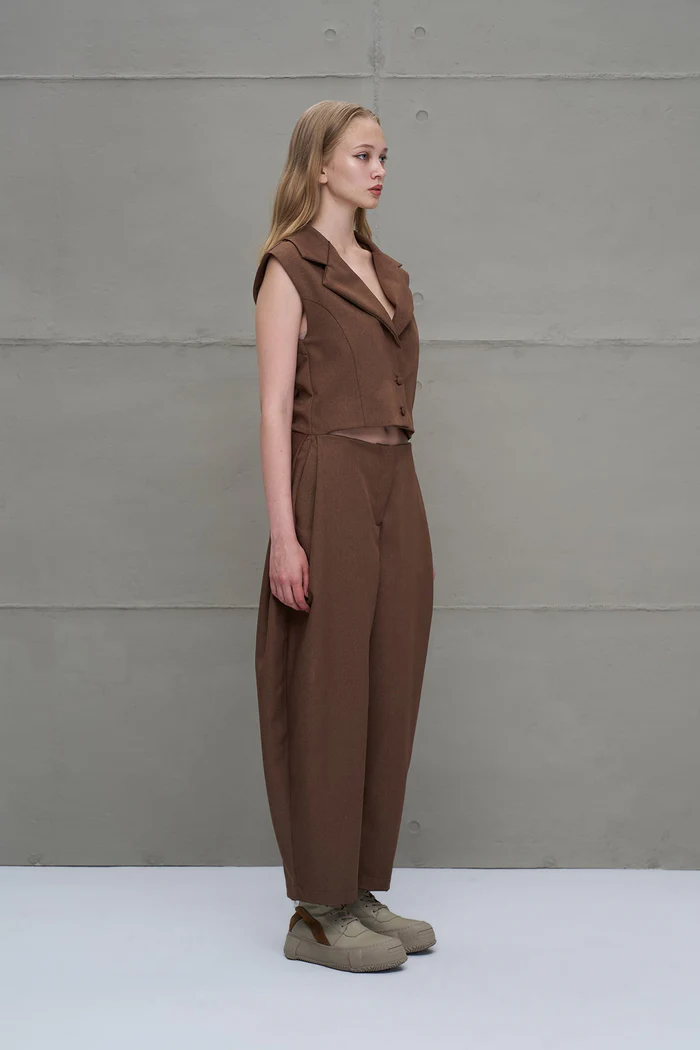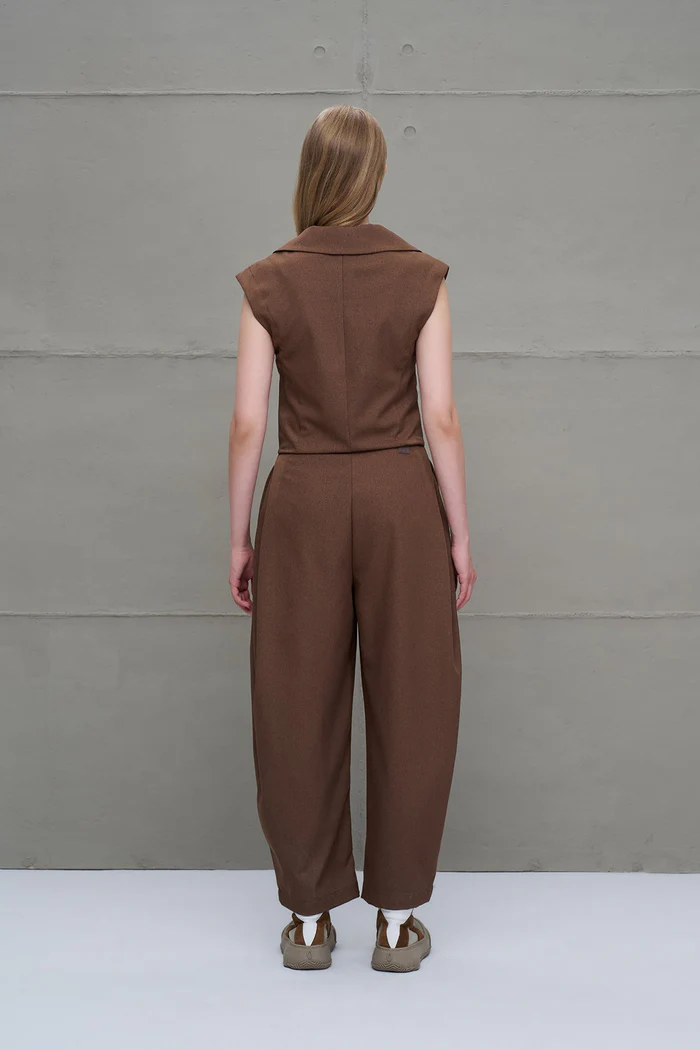 Macacão sem mangas com decote em v. Recorte na cintura, com efeito de duas peças. Corte reto efeito balão com caimento solto.