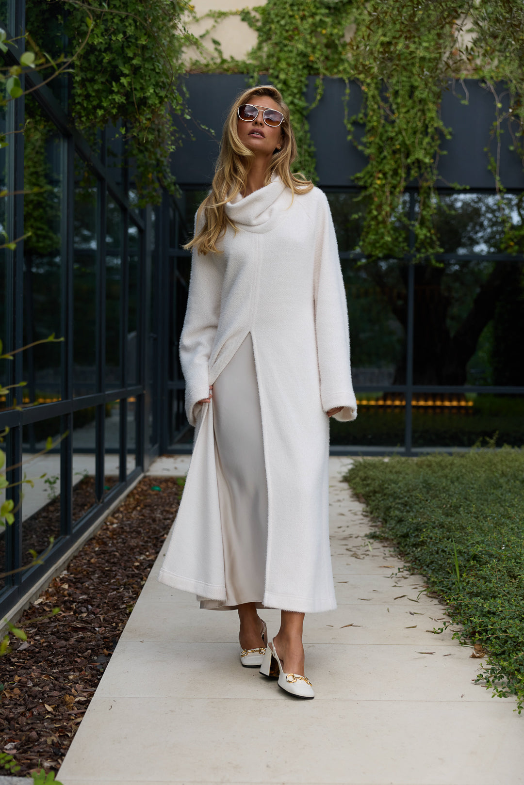 Túnica de gola alta e manga comprida. Pormenor de abertura frontal. Bainha com acabamento em abertura.