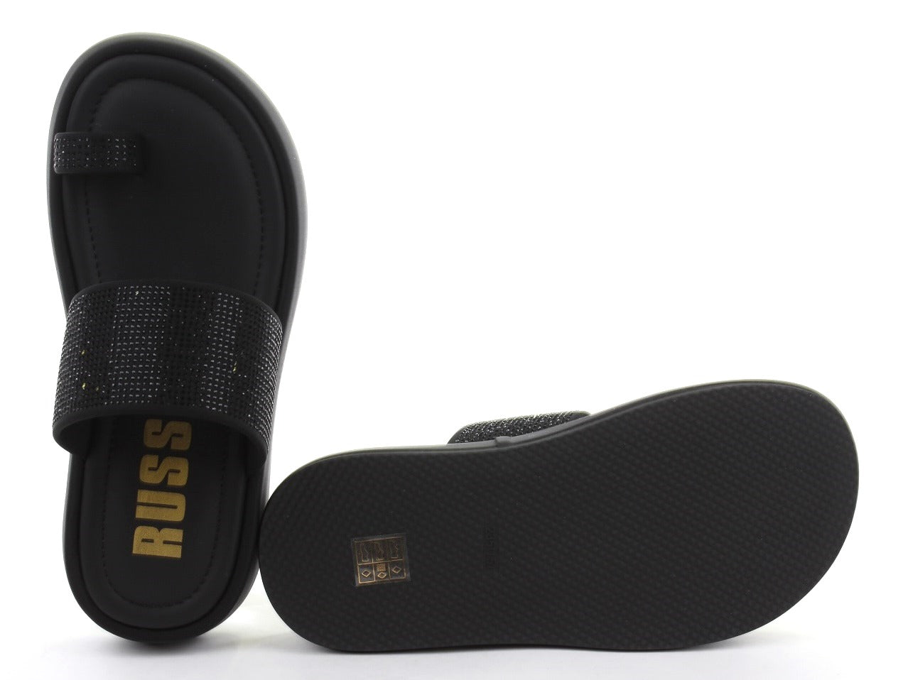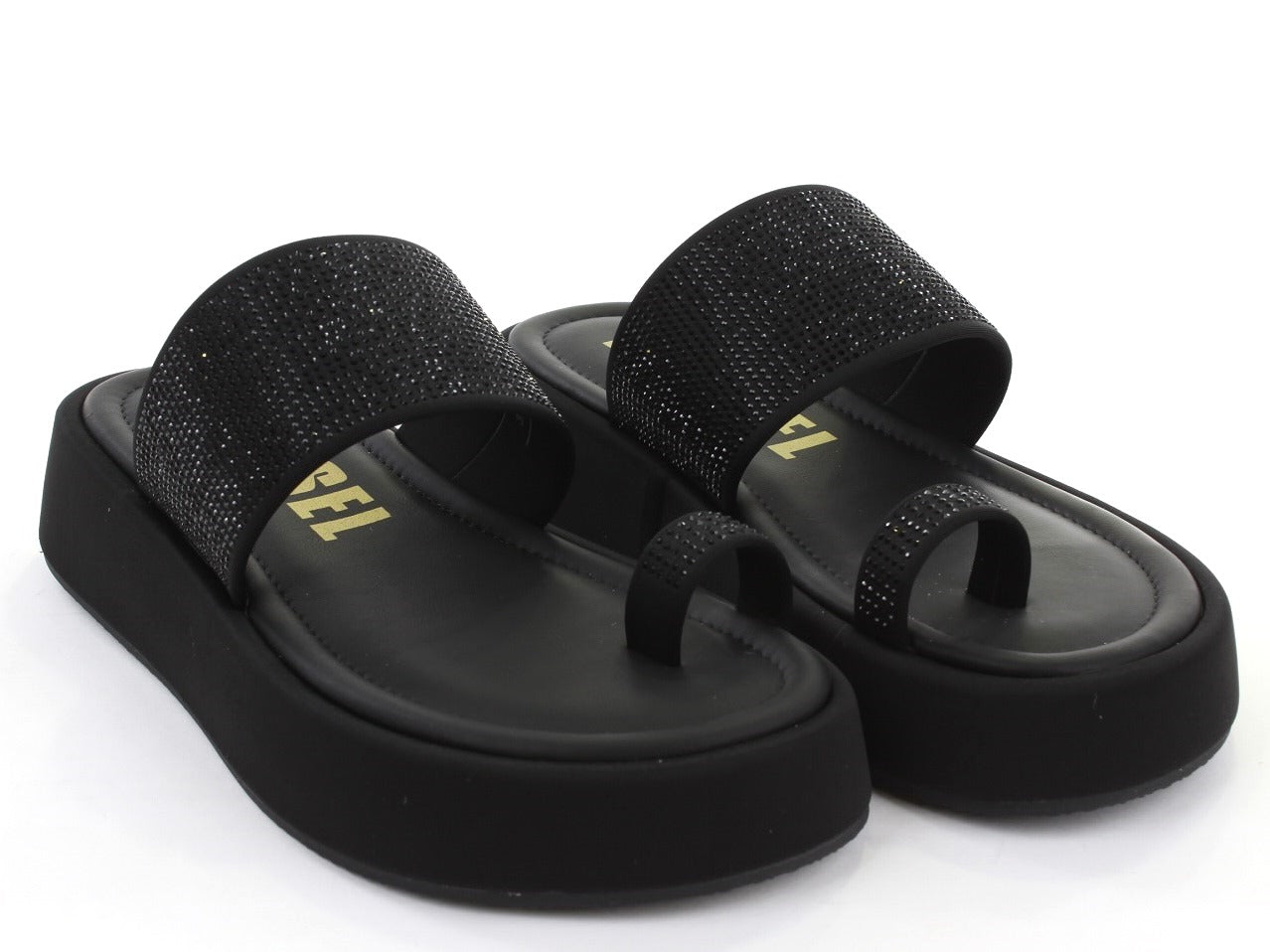 Chinelo slide em preto com tira larga adornada com strass brilhante, elevando o estilo para casual chic. Sola em plataforma oferece maior altura e conforto. Anel de dedo funcional garante estabilidade ao caminhar. Perfeito para um look descontraído com elegância. Altura do salto (cm): 3.