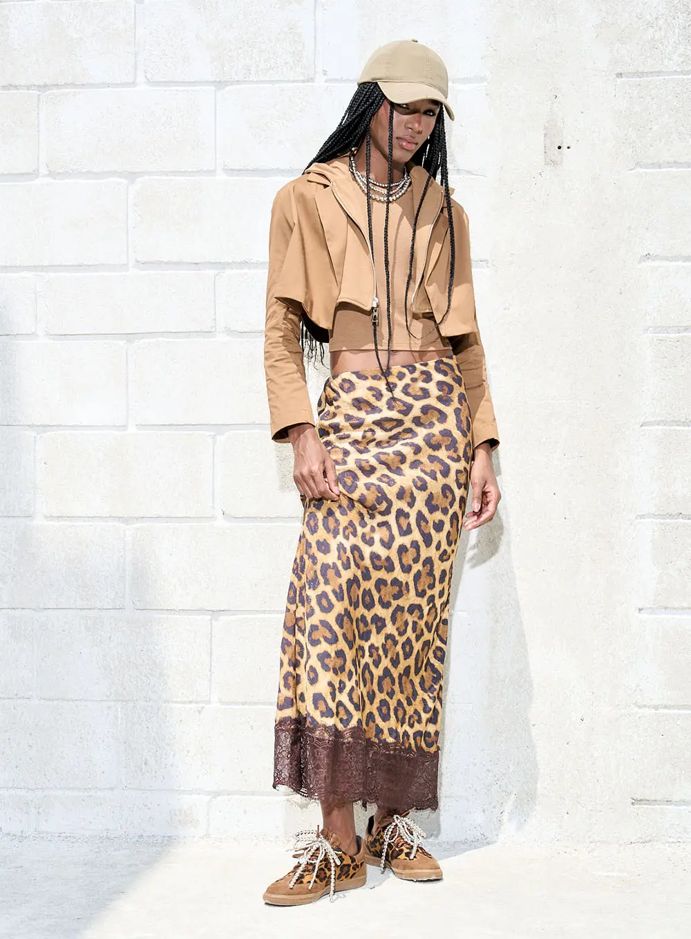 Maxi Saia estampada com detalhe de renda, fecho de correr oculto na costura.
