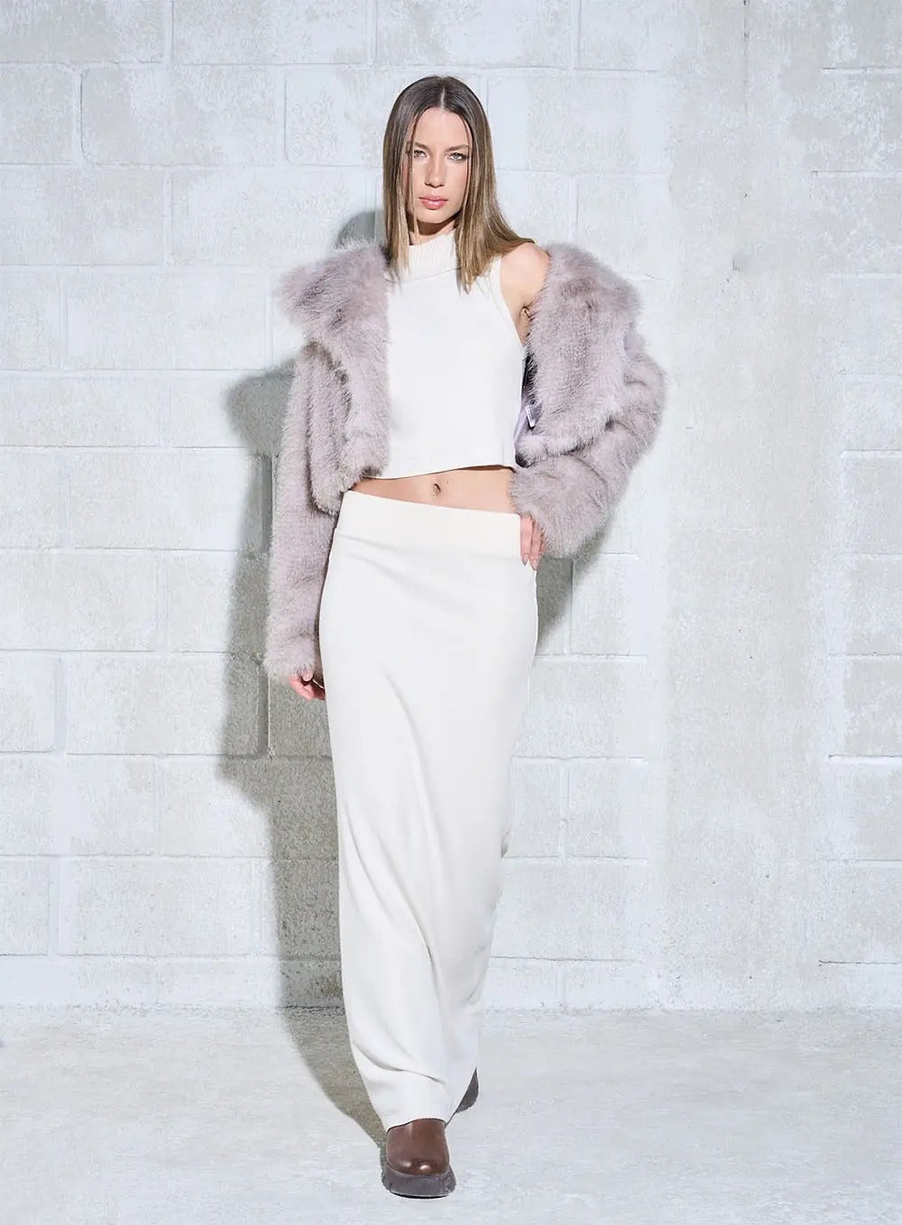Saia de cintura subida com cintura elástica.