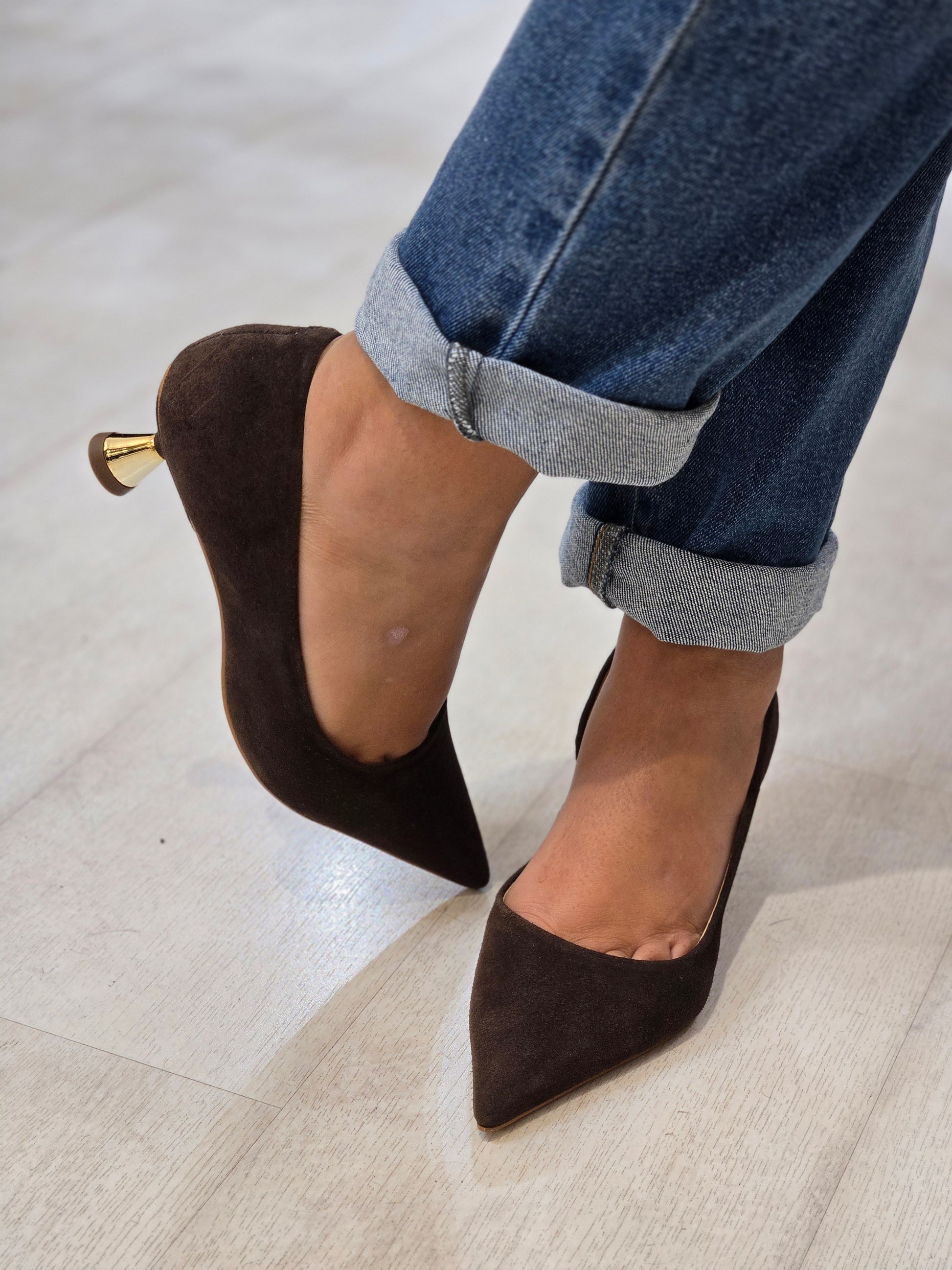 Sapato em camurça e salto alto em dourado. Corte com decote redondo. Acabamento em biqueira. Altura do tacão: 5,5cm.