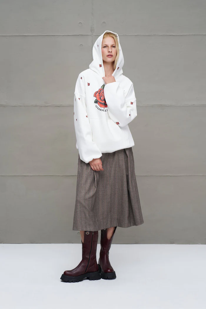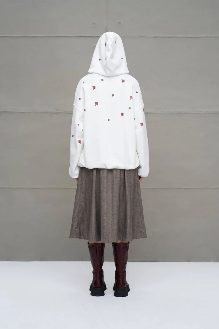 Sweat oversize com bolso canguru frontal. Detalhes de estampa rosas.