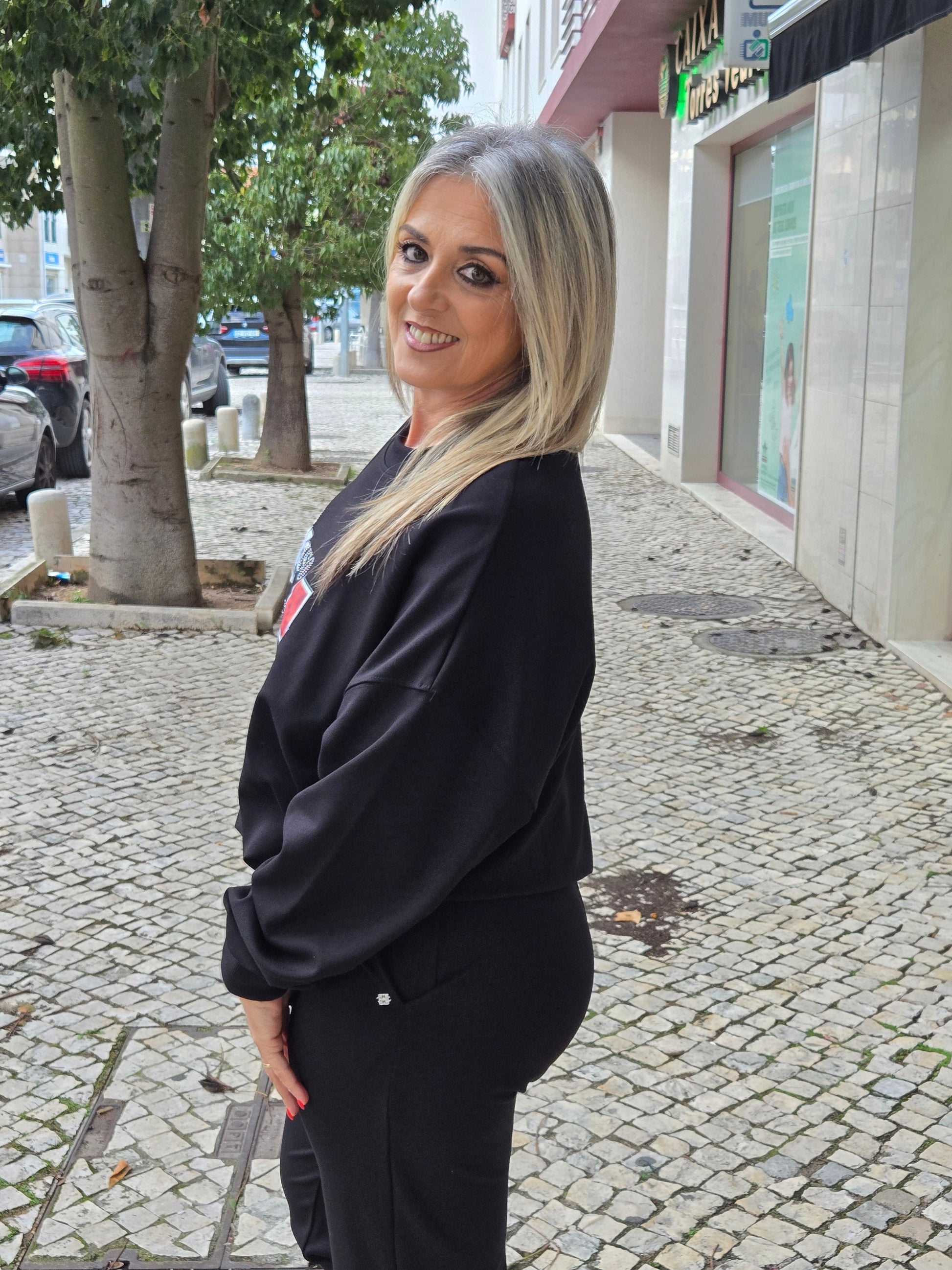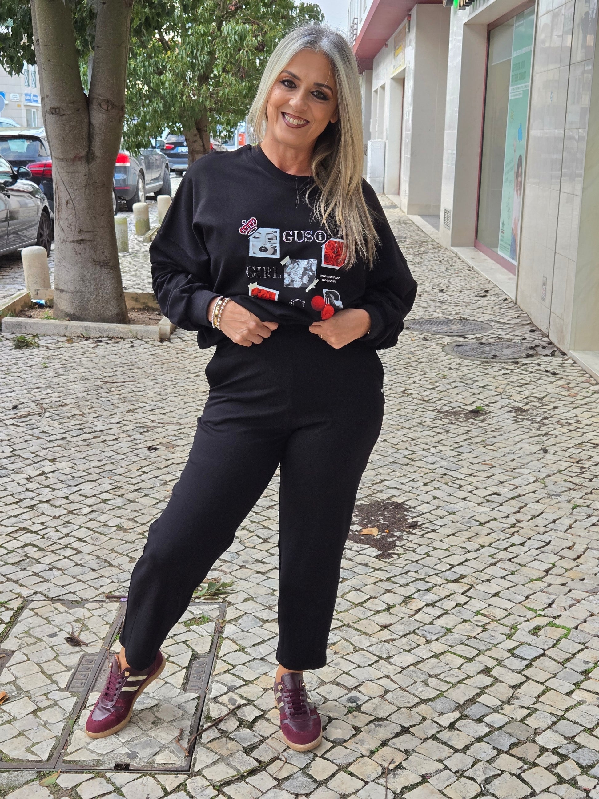 Estampa frontal. Decote redondo e manga comprida. Detalhe de gola, punhos e parte inferior canelados.