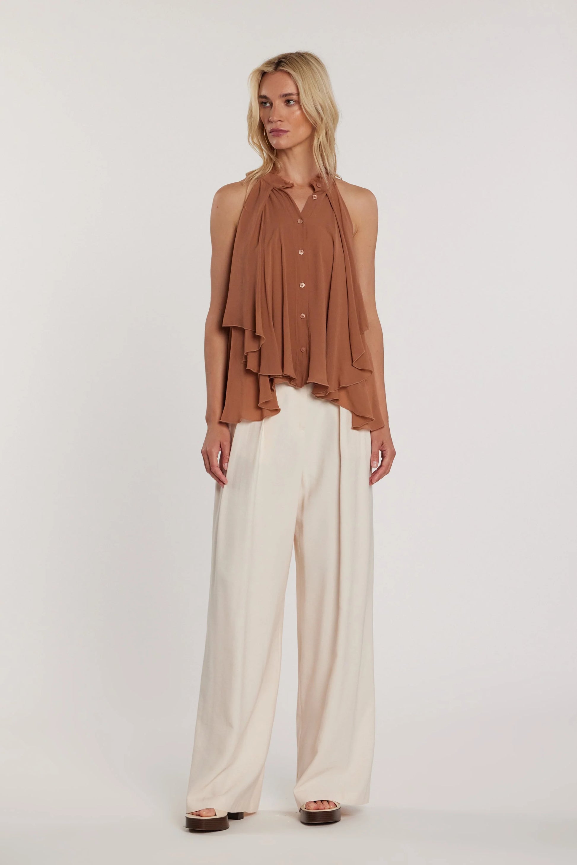 Camisa elegante com folhos que conferem movimento e feminilidade ao visual. Apresenta decote subido para um acabamento sofisticado e mangas caviadas que criam texturas interessantes. O fecho frontal com botões permite um ajuste personalizado e facilita o vestir. Peça versátil que combina com calças, saias ou shorts para looks do dia a dia ou ocasiões especiais.