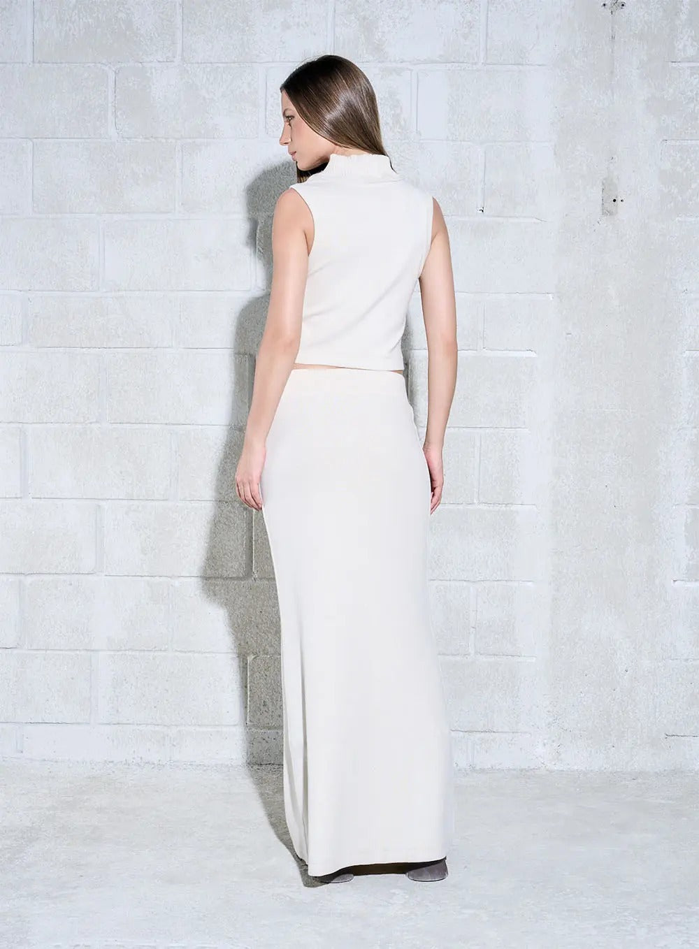 Top sem mangas com decote gola subida. Acabamentos em nervuras a condizer.
