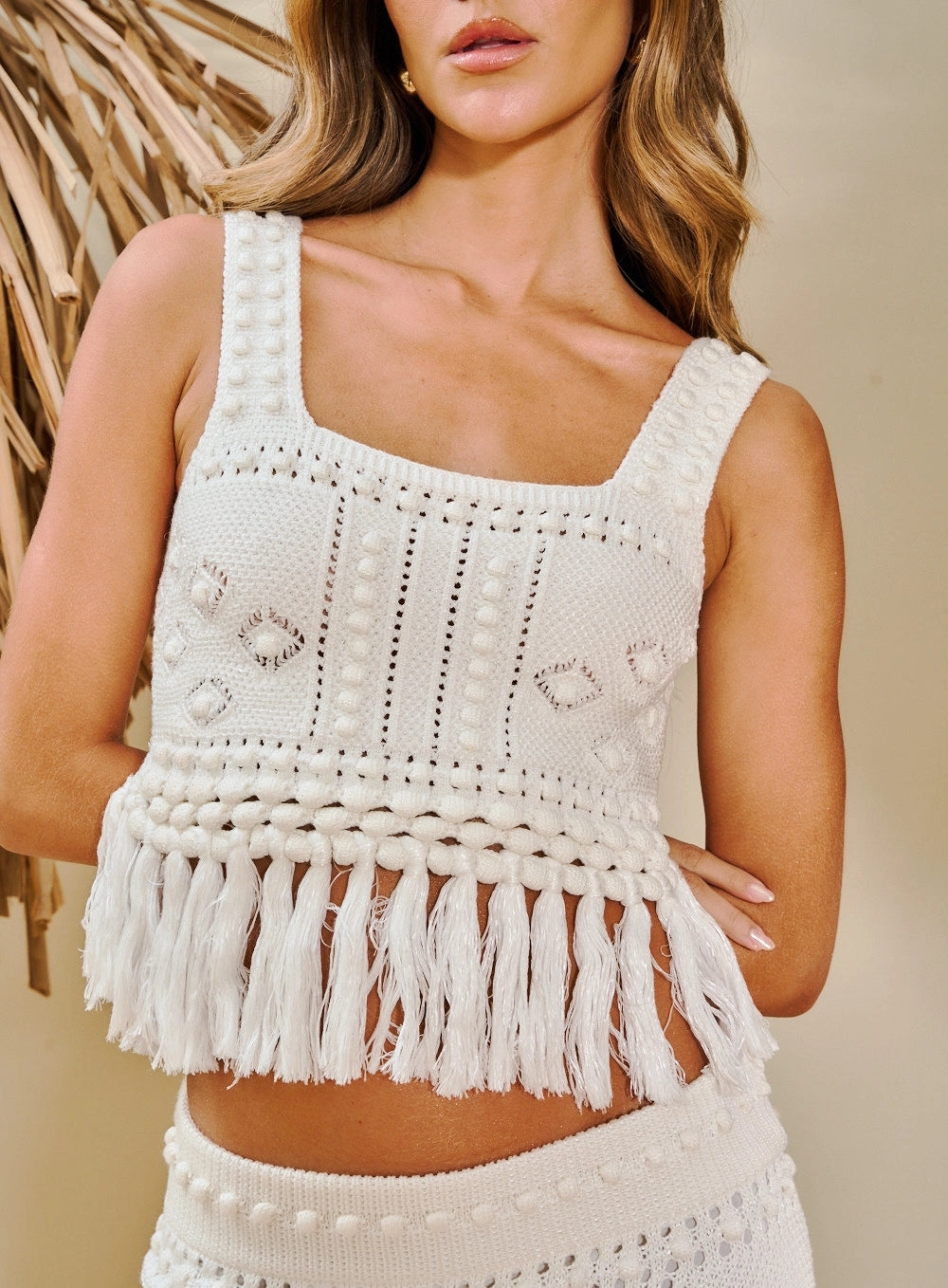 Top em tricot que combina elegância e conforto. Apresenta alças finas que realçam os ombros e franjas na parte inferior que adicionam movimento e textura ao visual. Ideal para criar looks sofisticado. A construção em tricot garante flexibilidade e respirabilidade, permitindo usar durante todo o dia com facilidade.