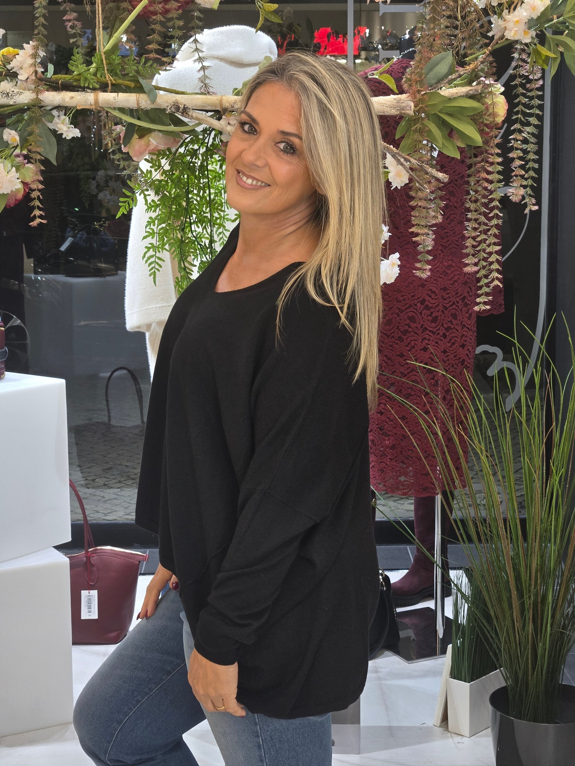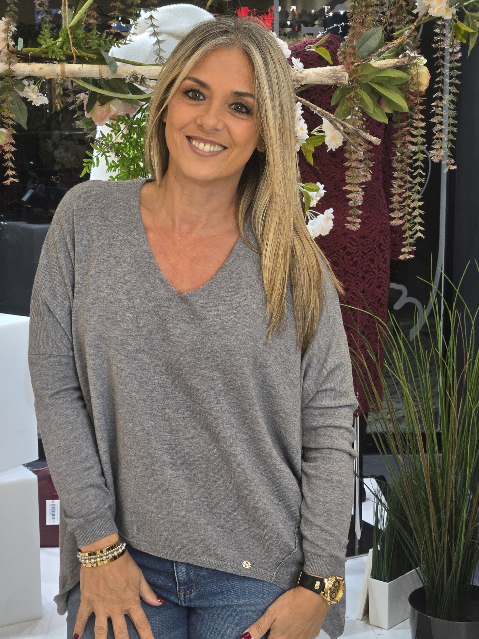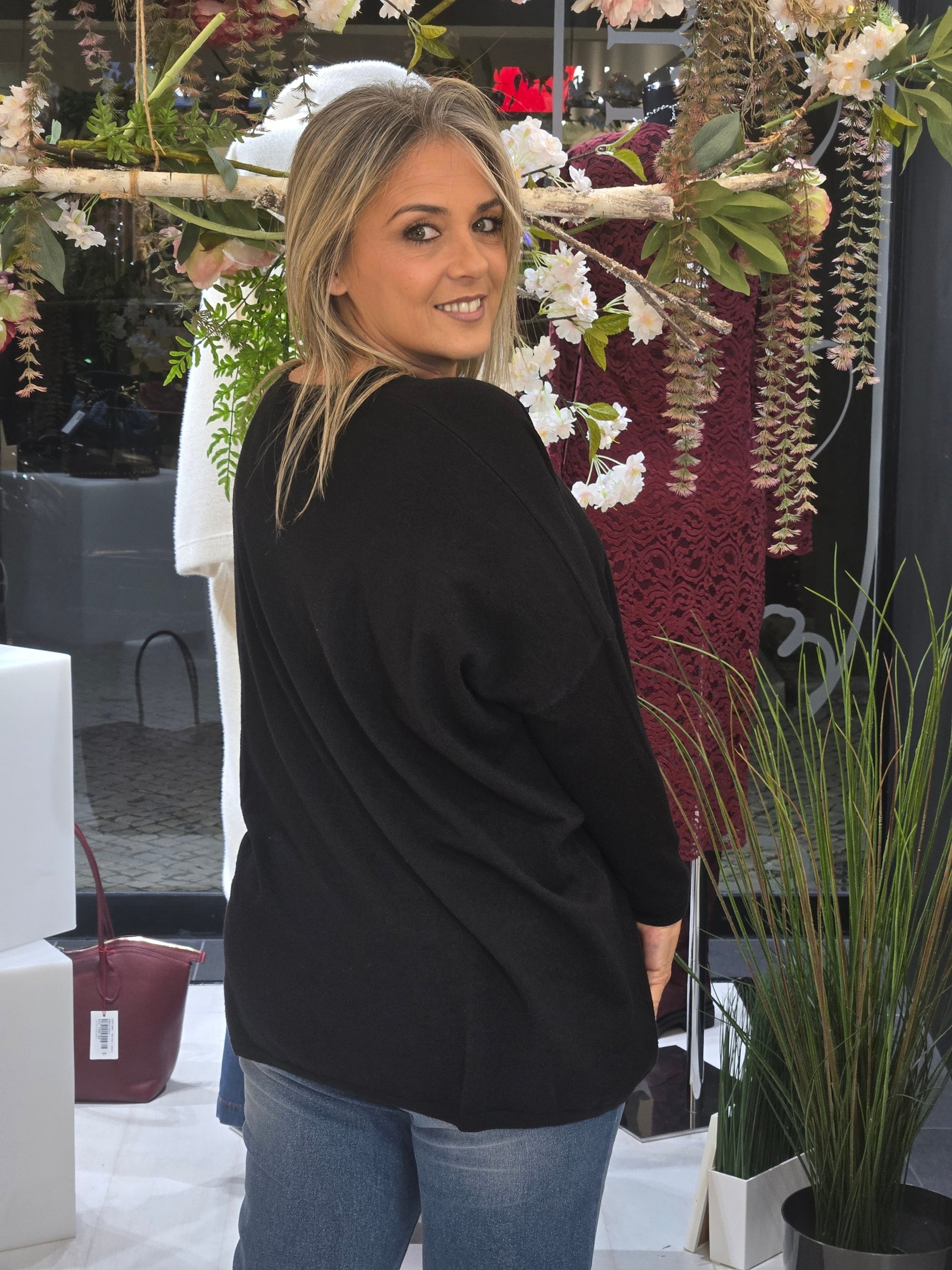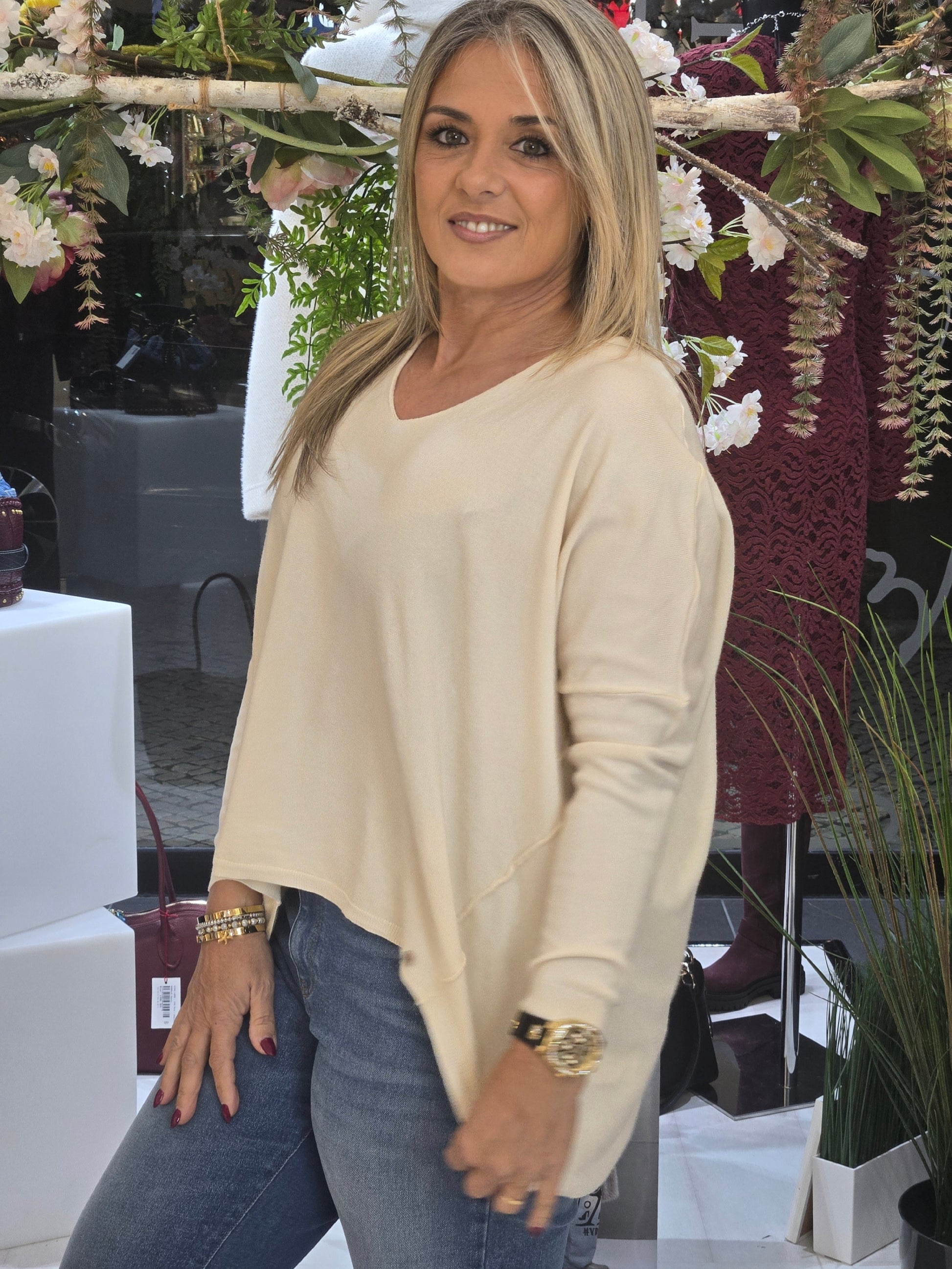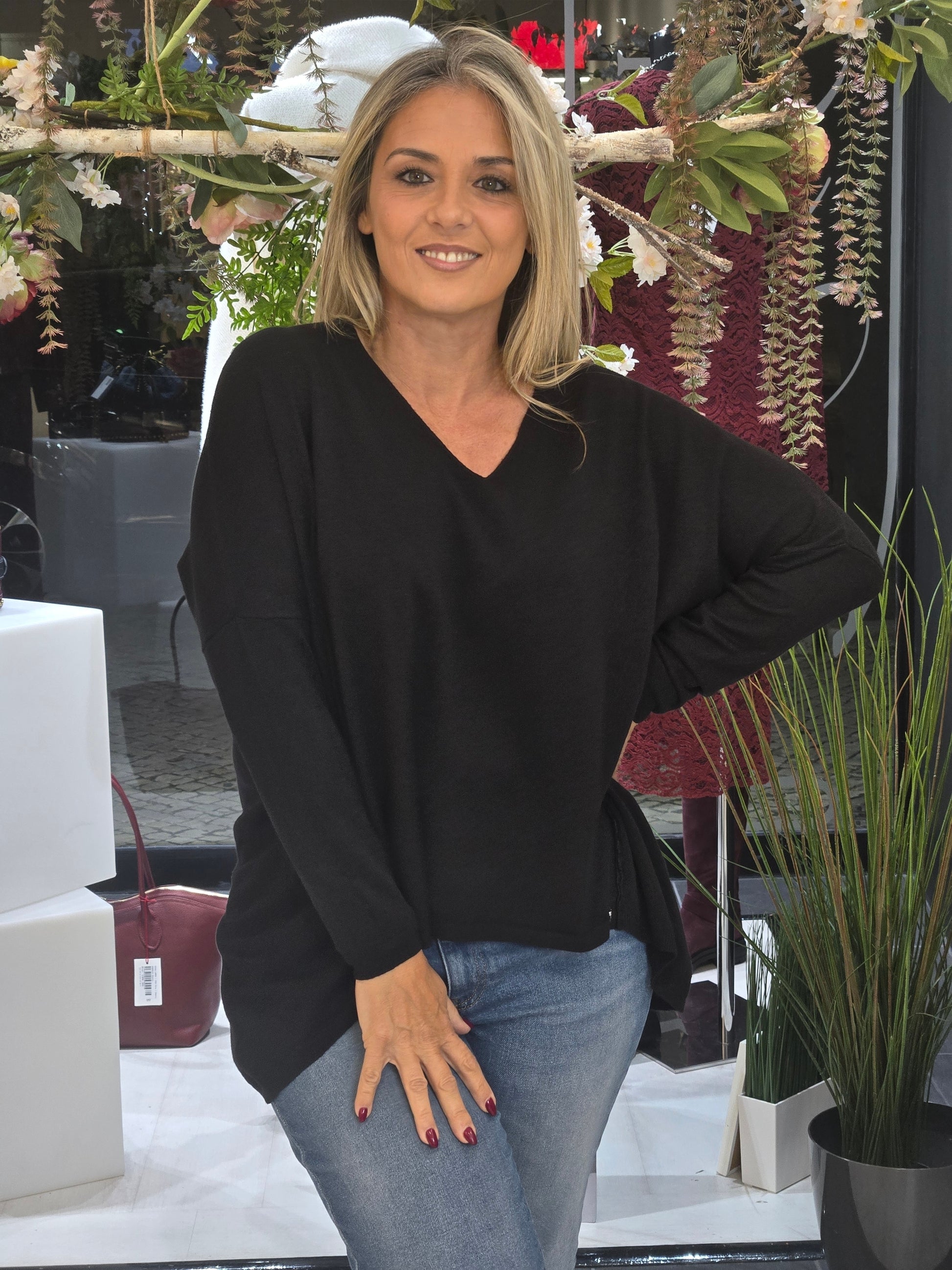 Túnica de decote em bico e manga comprida. Acabamentos assimétrico com costuras marcadas em contraste.