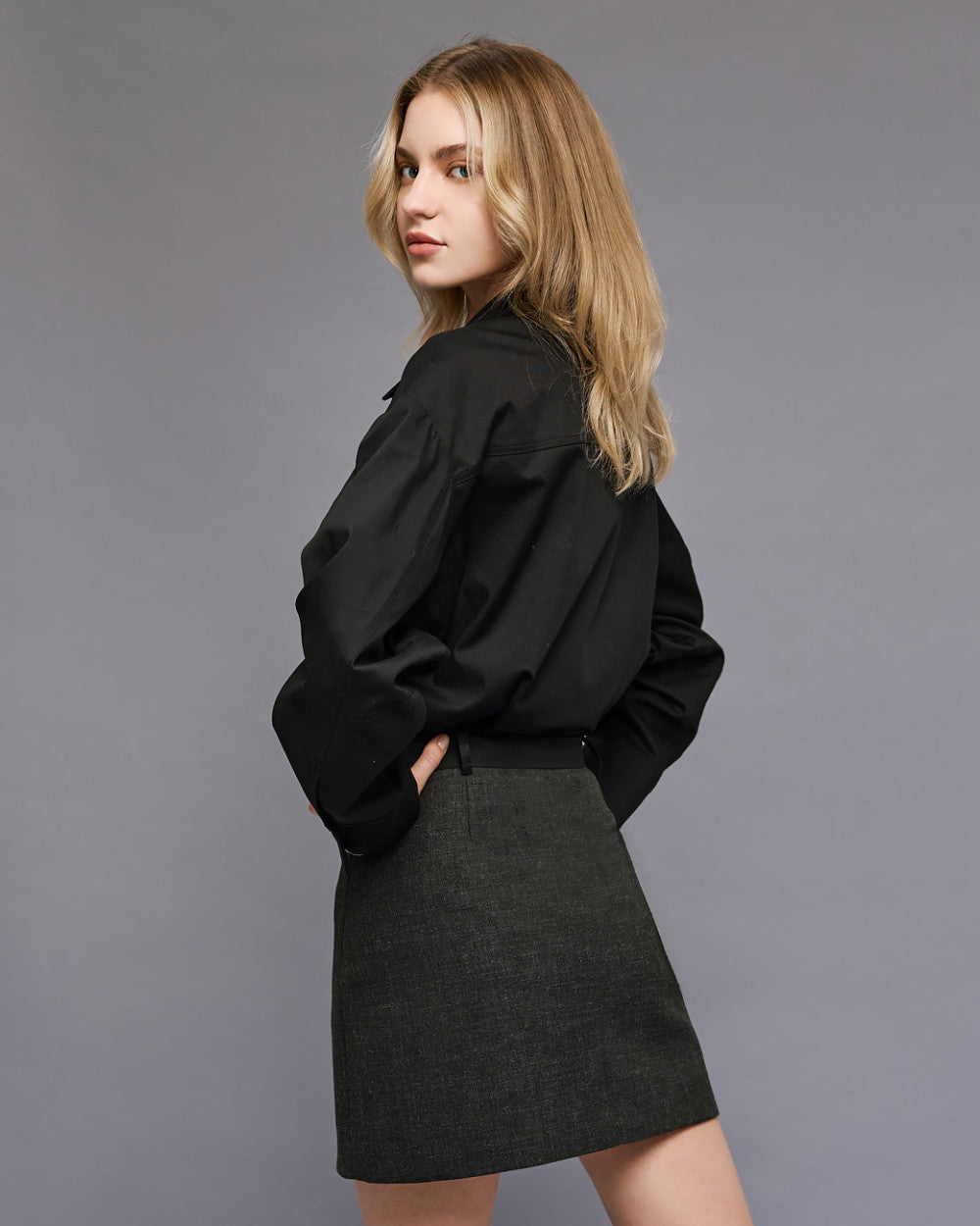 Mini vestido com blusa estilo camisa e calções internos na parte inferior. Acompanha cinto removível com fivela. Fecho frontal com botões.