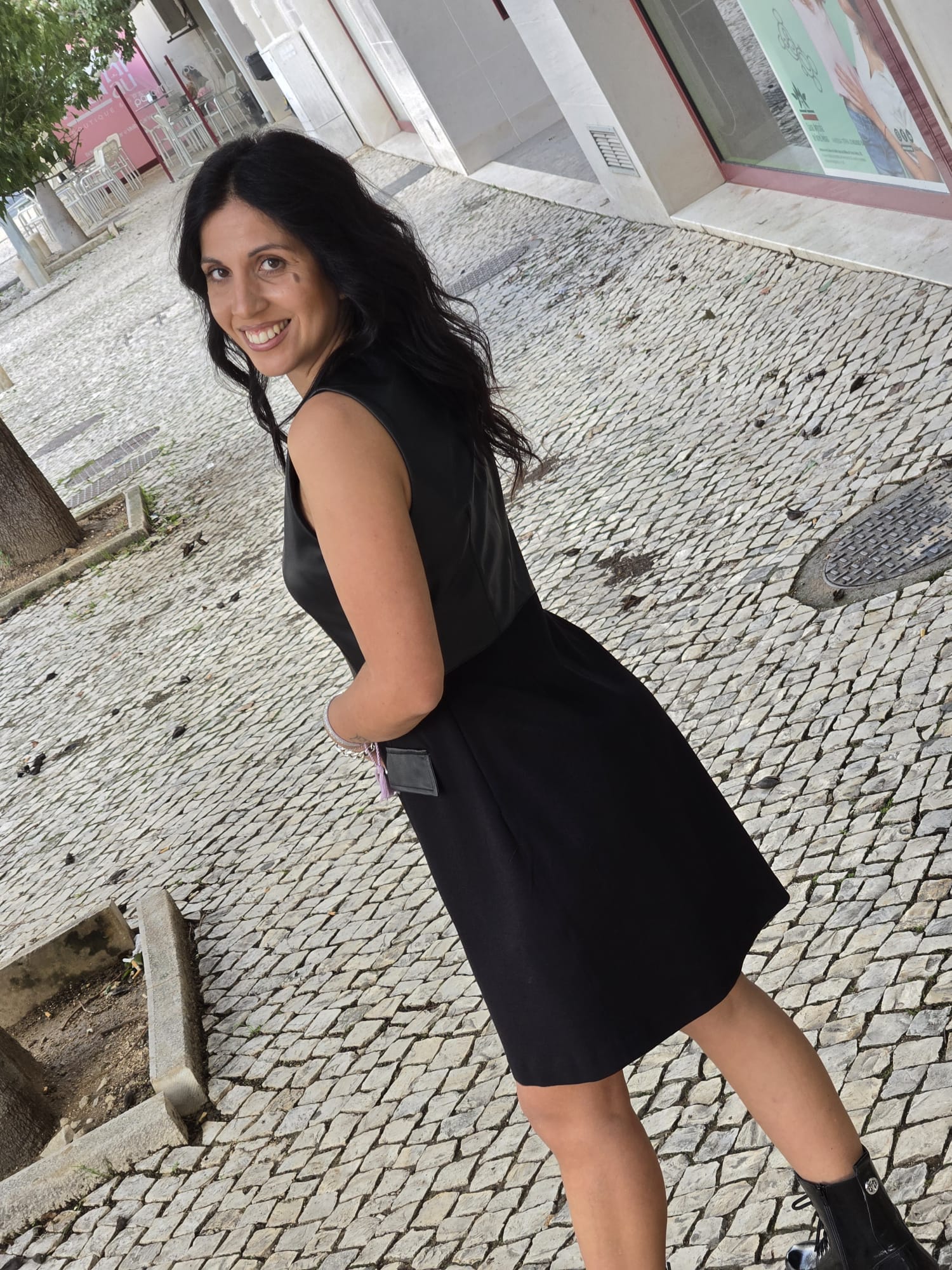Vestido com decote em V. Bolsos frontais embutidos decorativos. Parte de cima e bolsos em ecopele. Fecho lateral com fecho de correr.