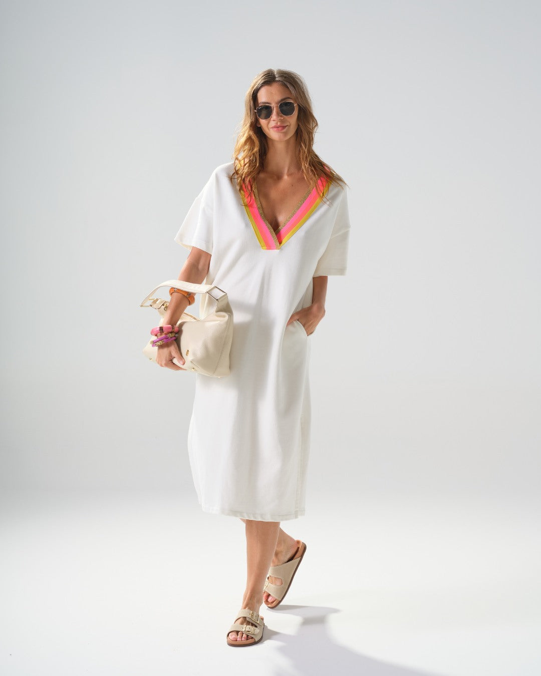 Vestido listado com decote em V e mangas curtas, perfeito para um visual moderno e descontraído. Destaca-se pelos detalhes em cores neon que criam um contraste vibrante com as listras. Detalhe de bolsos laterais, é ideal para quem gosta de peças versáteis que combinam conforto, estilo contemporâneo e praticidade.